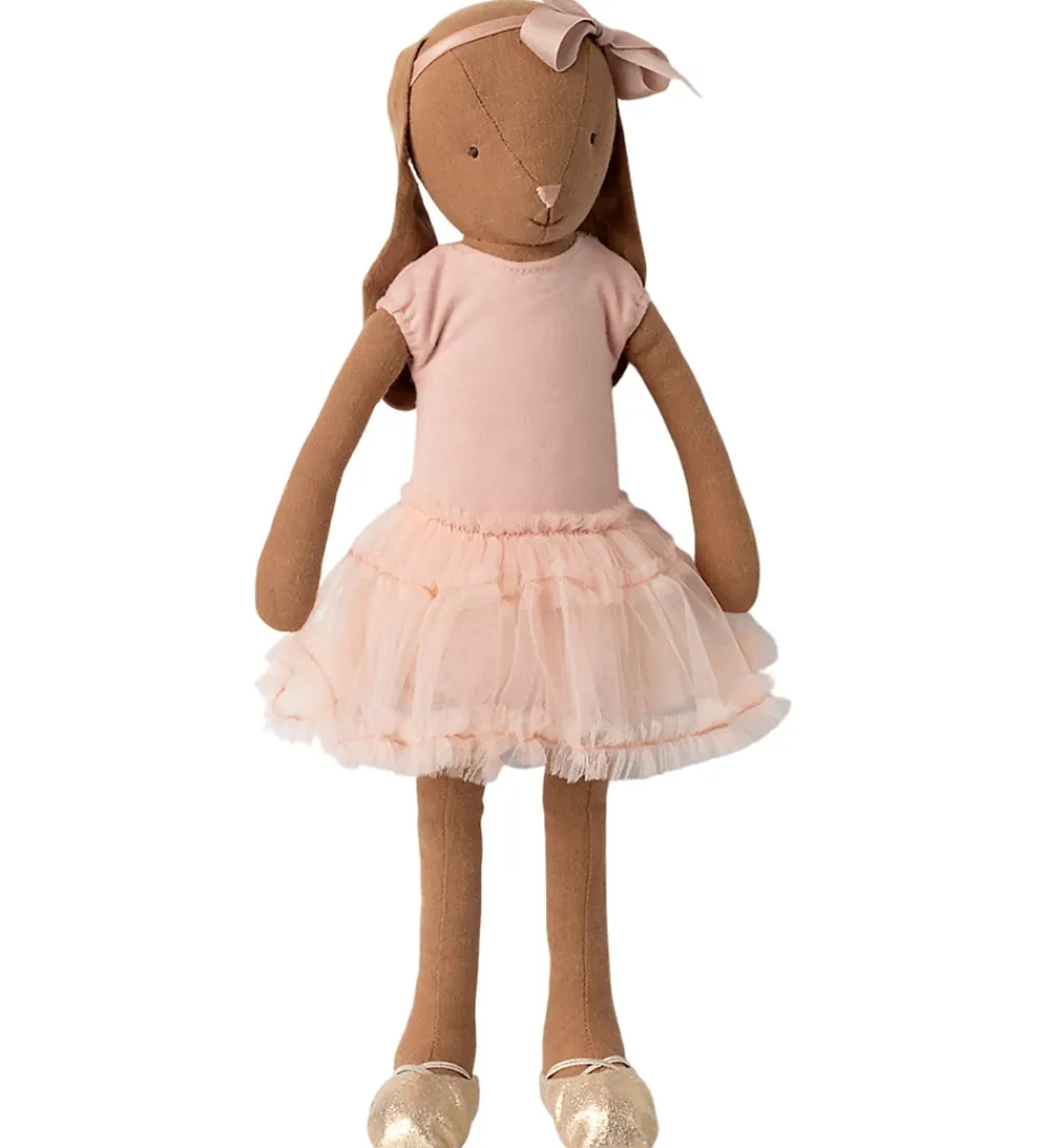 Fin Maileg kanin i brun iført en rosa balletdragt og et tylskørt.