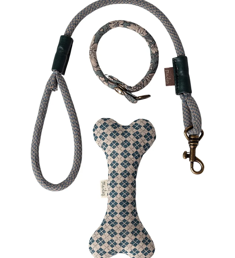 Charmerende Maileg kuffert med hundetilbehør i blå med blomsterprint i beige nuancer. Sættet inkluderer en sød, lille stofknogle og en hundensnor med matchende halsbånd i blå og beige nuancer.