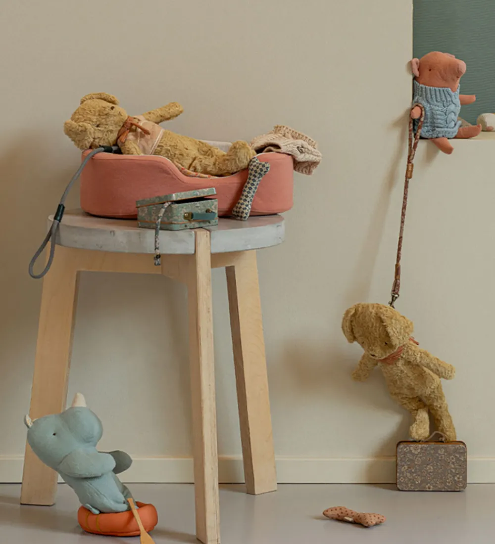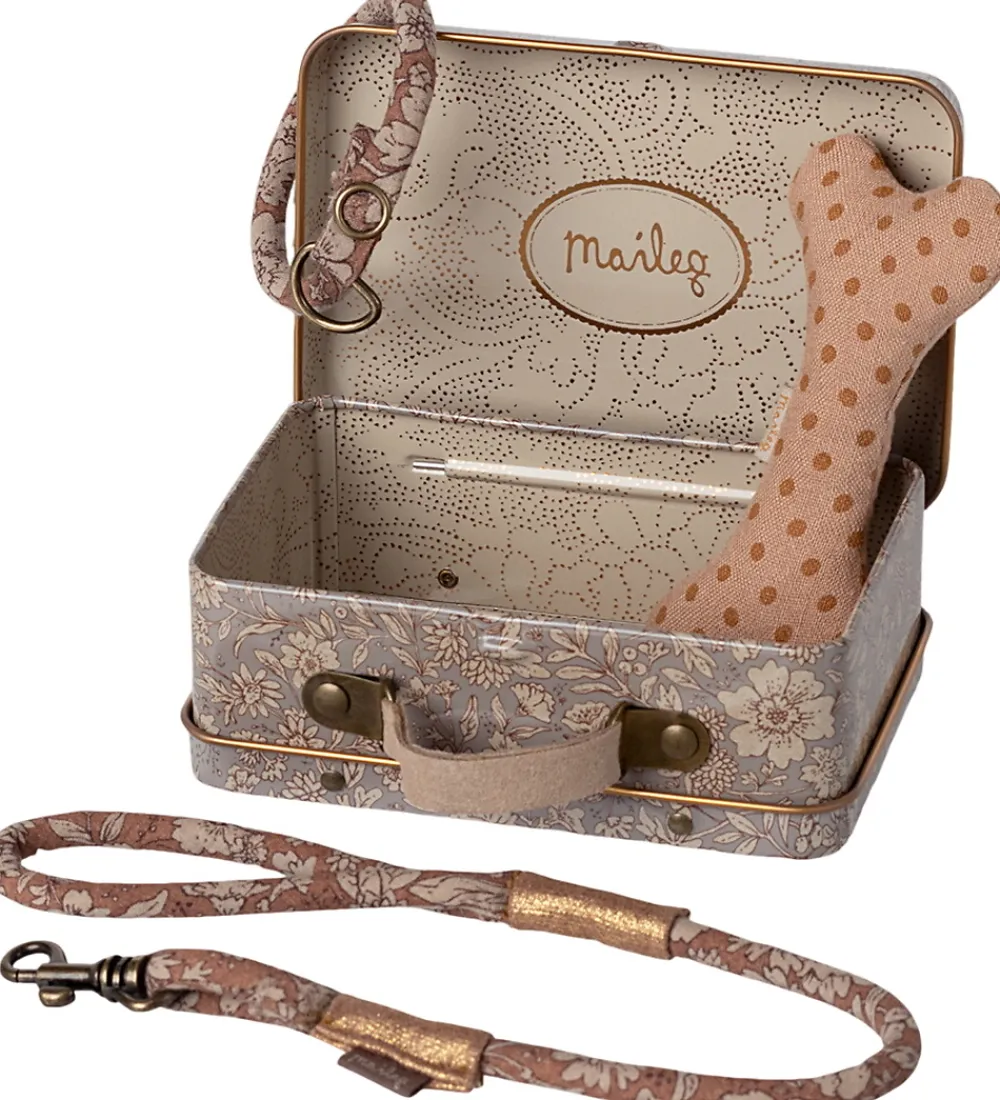 Charmerende Maileg kuffert med hundetilbehør i grå med blomsterprint i beige nuancer. Sættet inkluderer en sød, lille stofknogle og en hundensnor med matchende halsbånd i brun med beige blomster.