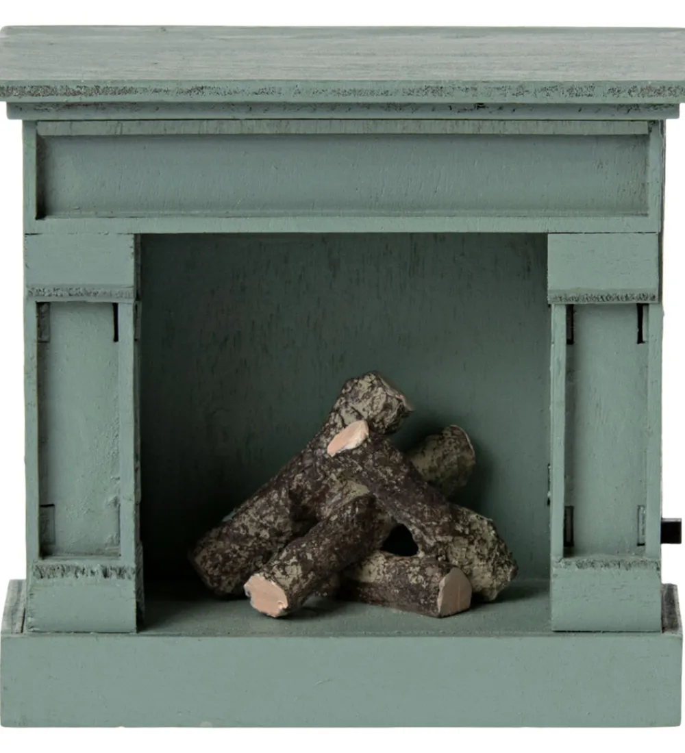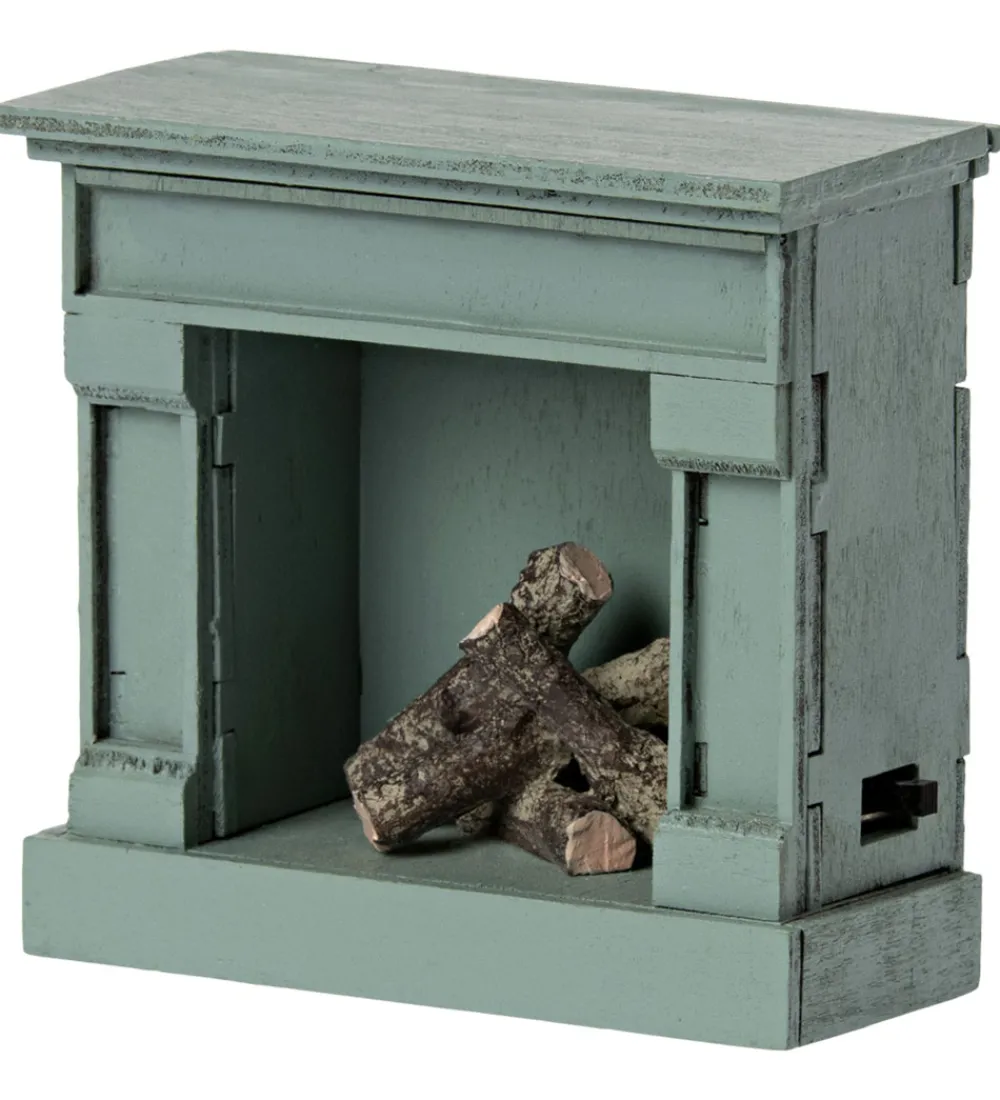Flot Maileg pejs i blå og tilføjer en hyggelig atmosfære til legestunden med det bløde lys.
