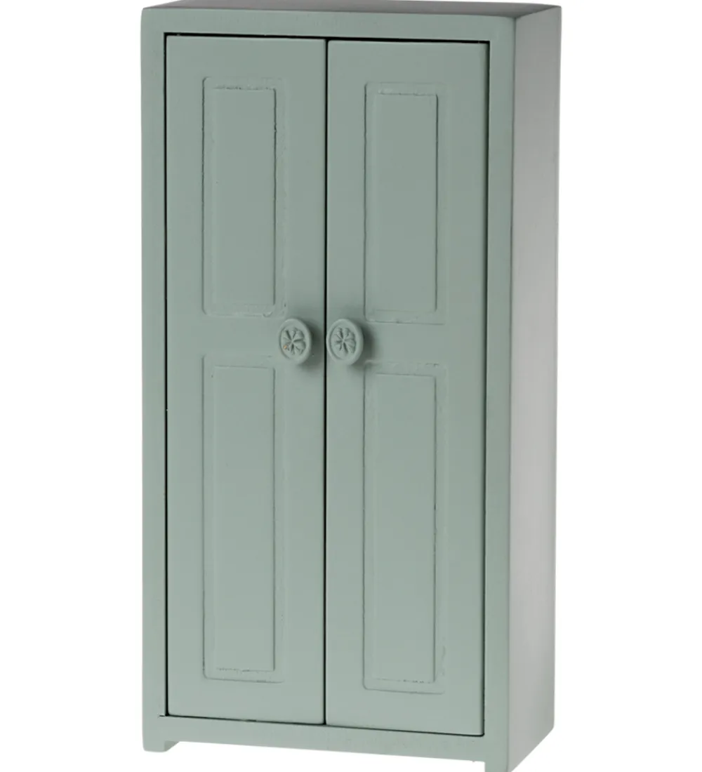 Elegant Maileg dukketilbehør i en blød lyseblå farve. Skabet har to døre og et enkelt, fint design.