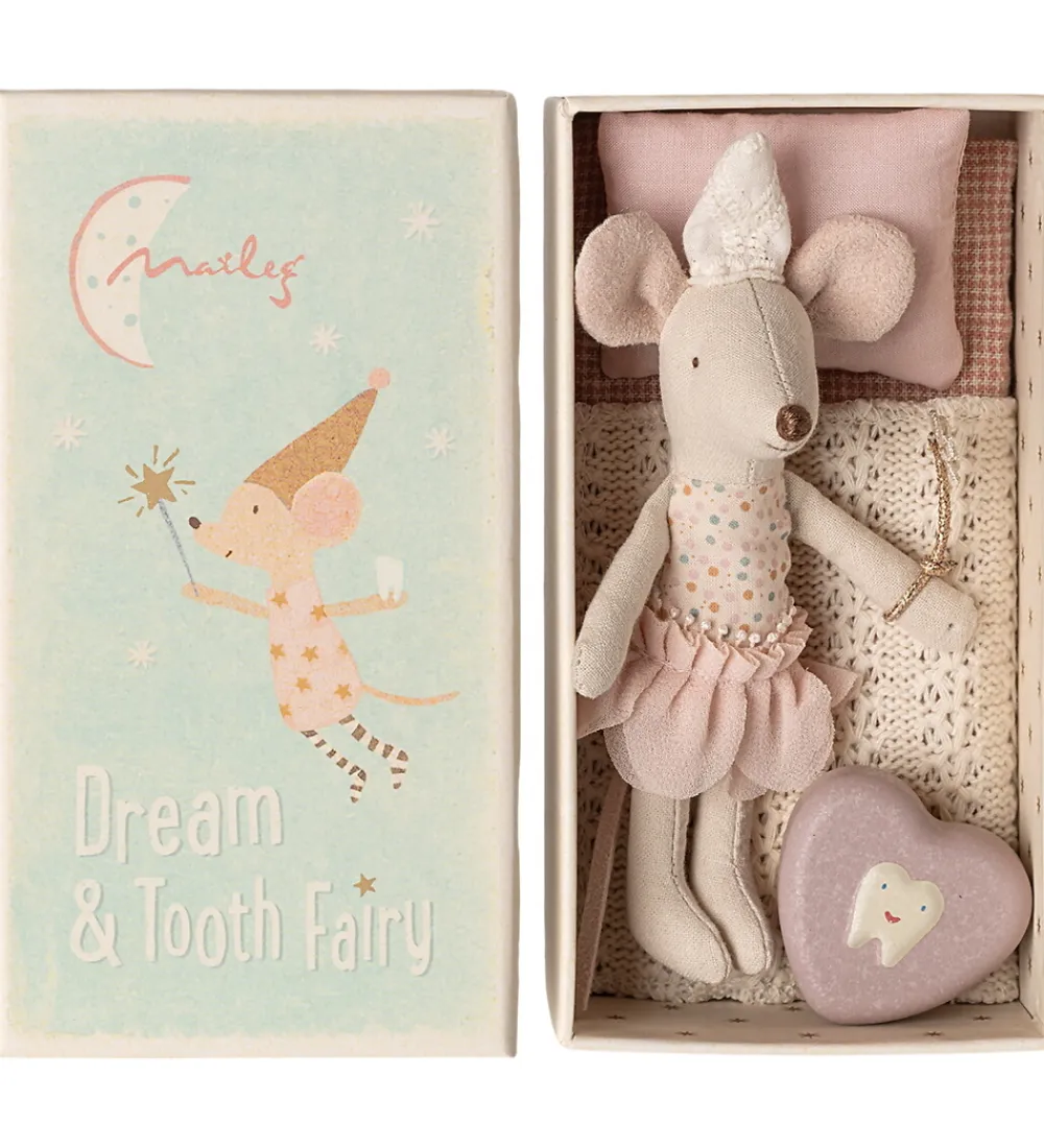 Musen leveres i en flot tændstikæske med dyne, pude og tæppe samt en tandæske, der fuldender det søde eventyrunivers med tandfe-tema. En lille ven med stor personlighed.
