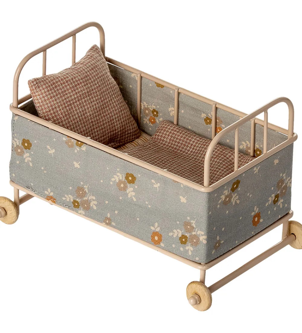 Maileg tremmeseng passer til Mailegs legetøj i størrelse mikro og gør familielegen komplet. Tremmesengen er på hjul og kommer med en gul dyne og en blød madras og pude i flotte, rosa mønstre.