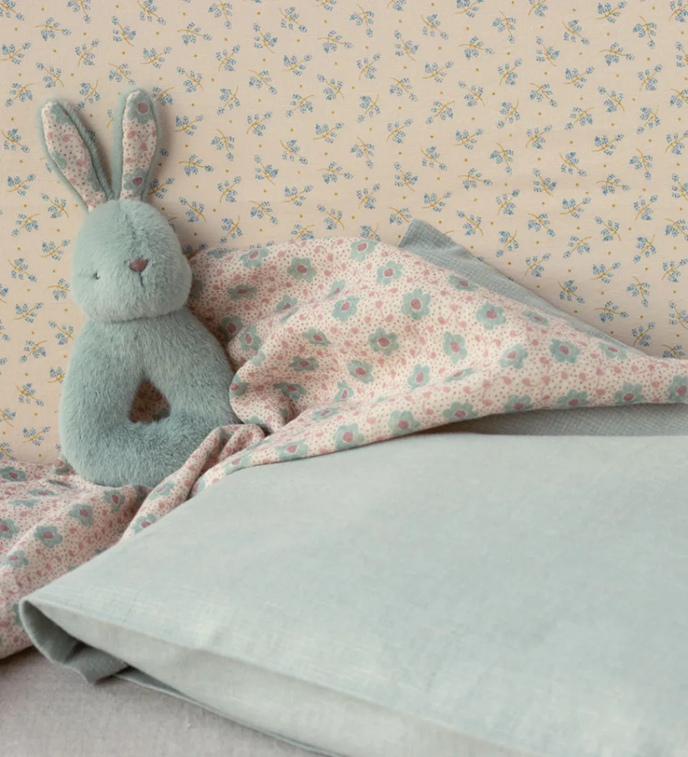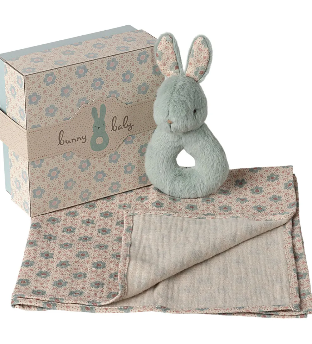 Fin Maileg ranglesæt bestående af en blød stofble i beige musselin med et blomsterprint i rosa og blå. Ranglen har form som en sød hare og har en behagelig raslelyd, hvilket gør den både charmerende og sjov for de mindste. Maileg ranglesættet er den perfekte gaveide.