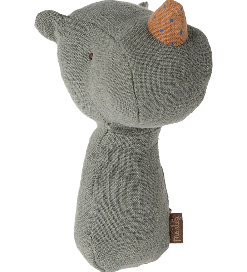 Sød Maileg rangle formet som en mørkegrøn næsehorn med et sødt prikket print på hornet.