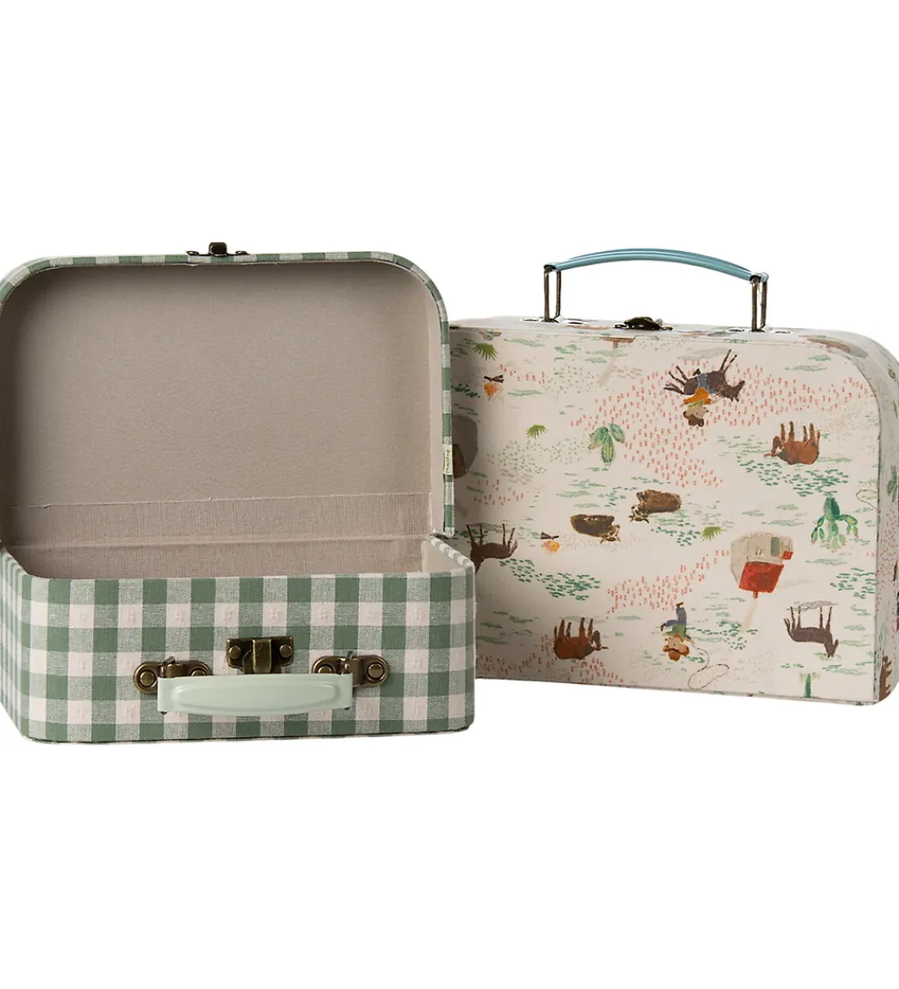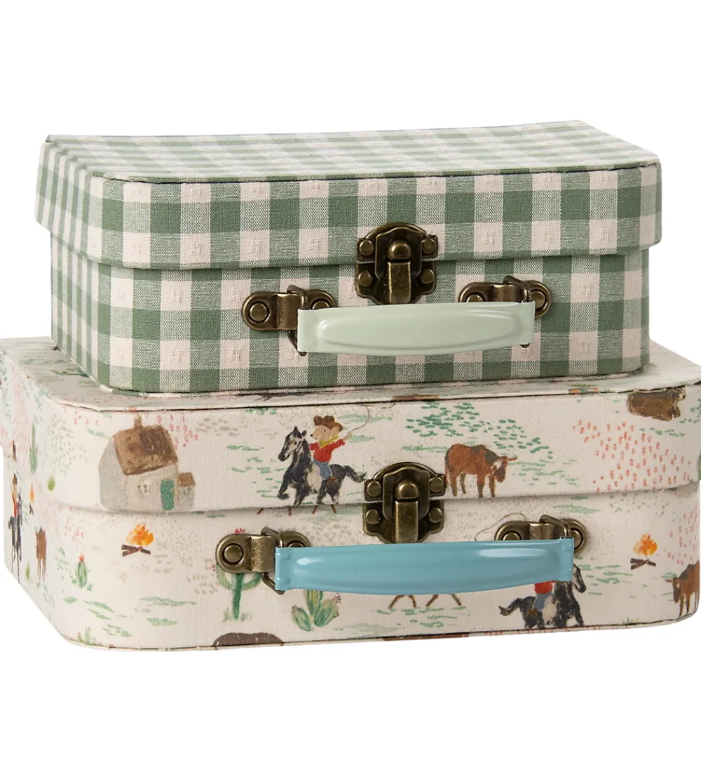 Smart Maileg kuffertsæt bestående af to, fine kufferter beklædt i stof. Den ene kuffert kommer i en fin grøn med tern, mens den anden er i beige med et skønt print af cowboys. Perfekt til opbevaring af legetøj.