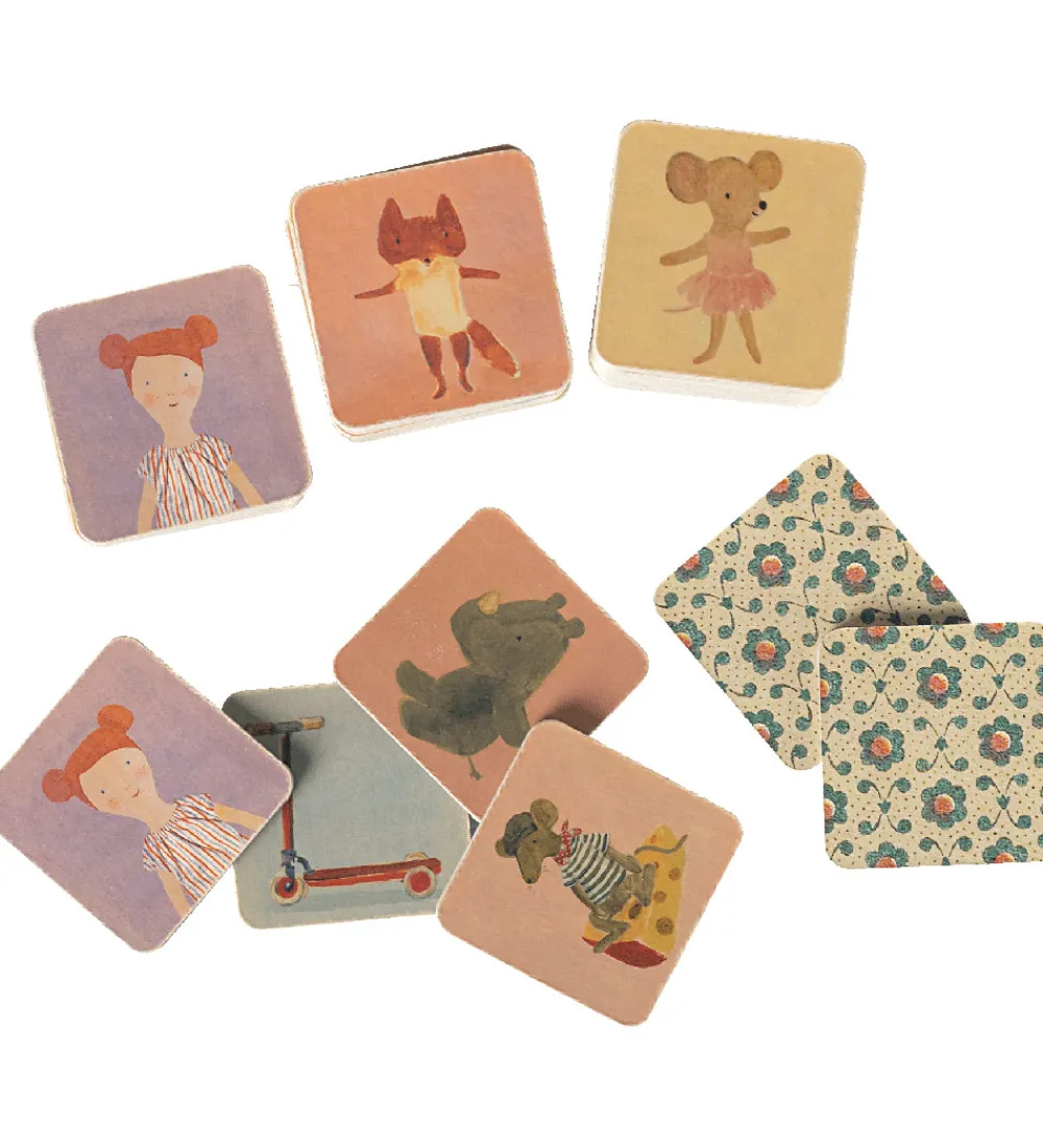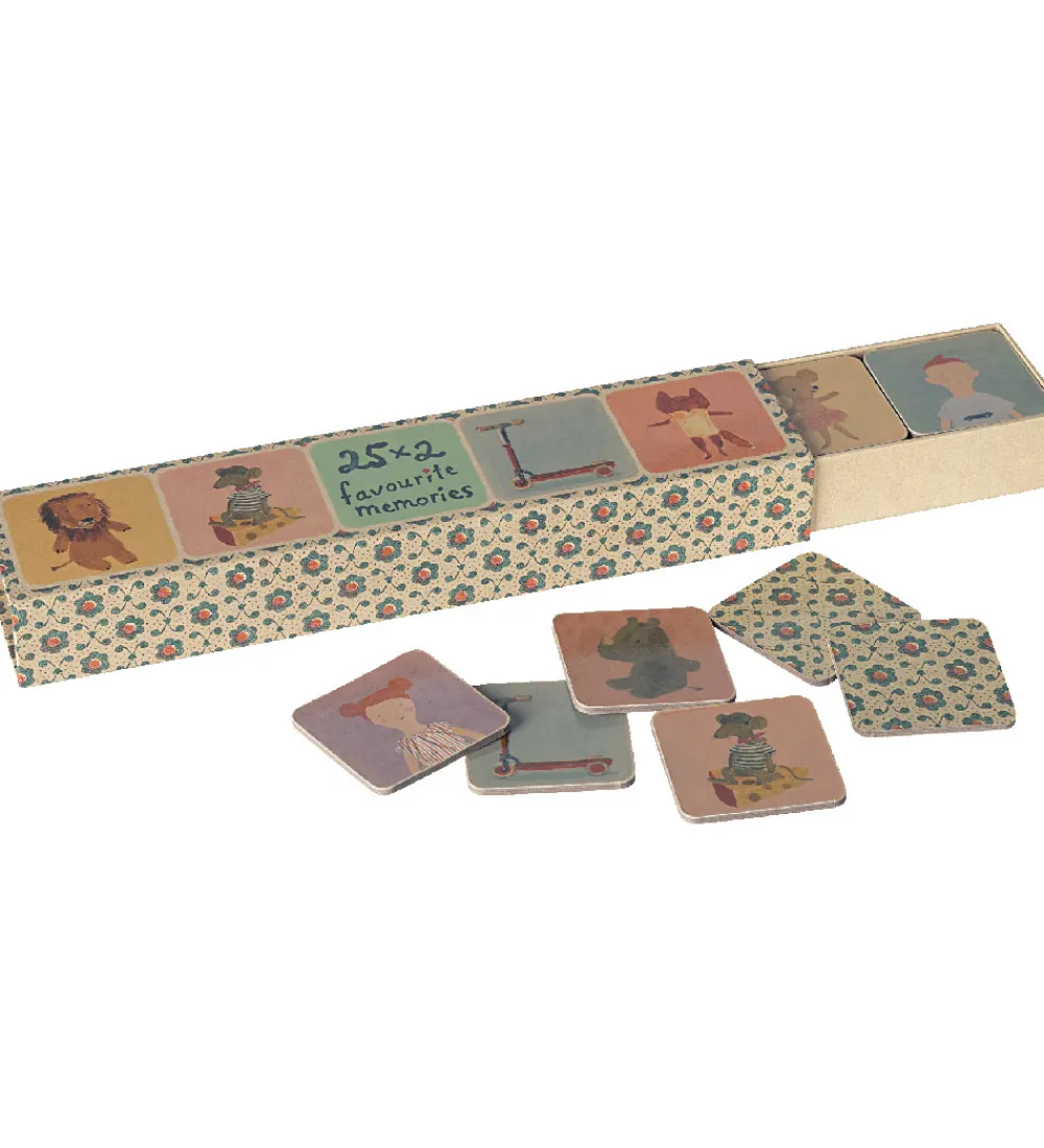 Skønt Maileg vendespil med en smuk æske, der indeholder 50 brikker á 25 par kort med søde illustrationer af dyr og figurer. Spillet er i en pastel farvepalet og er designet til at styrke hukommelsen.
