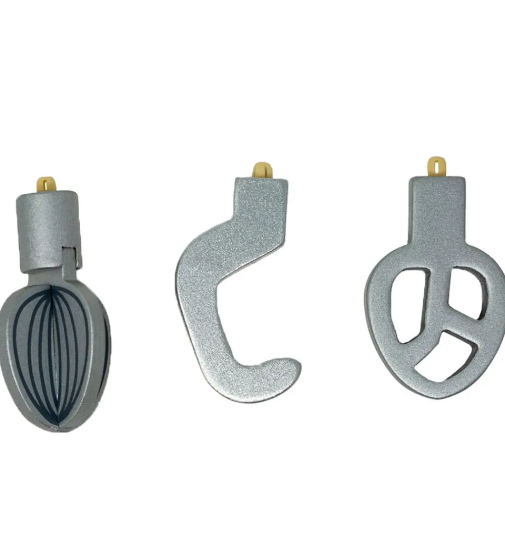 MaMaMeMo røremaskinen ligner den ægte vare og på toppen kan man dreje et hjul, som roterer mixeren i bunden. Røremaskinen kan åbnes, for at sætte skålen ind og skifte tilbehøret.
