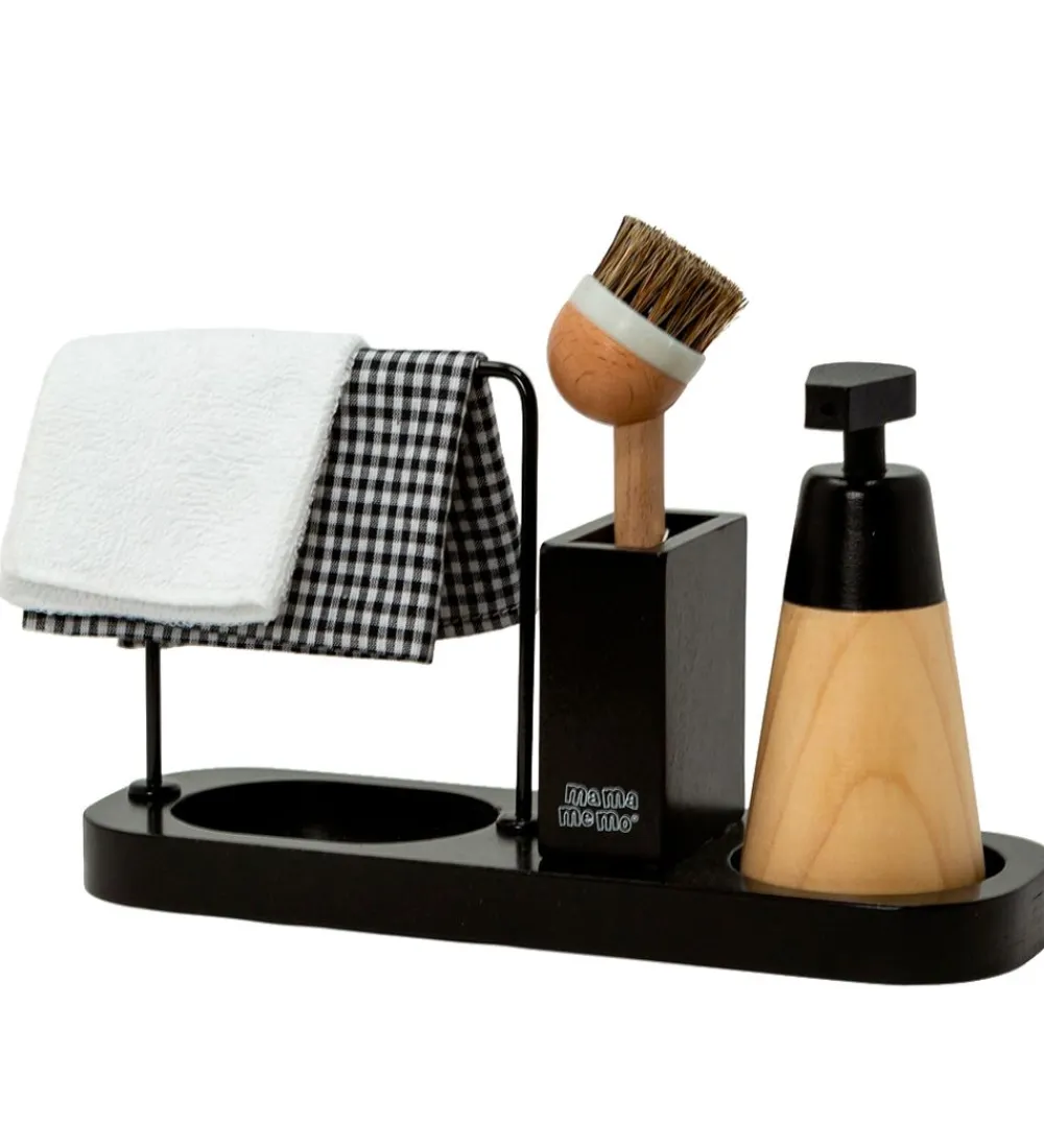 Sødt MaMaMeMo opvaskesæt i sort og træ. Opvaskesættet består af følgende: