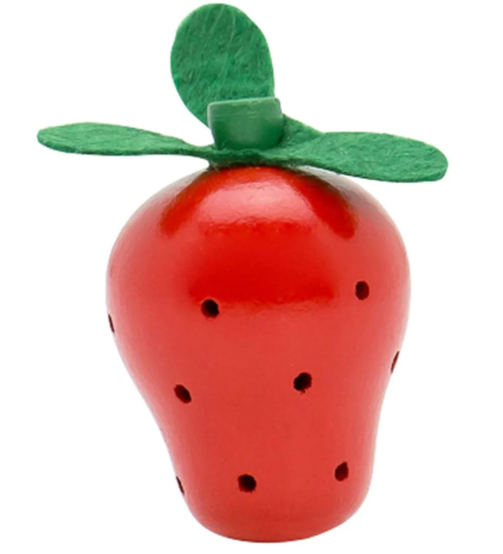 Underholdende MaMaMeMo legemad bestående af et jordbær, med et grønt stykke fleece i toppen.