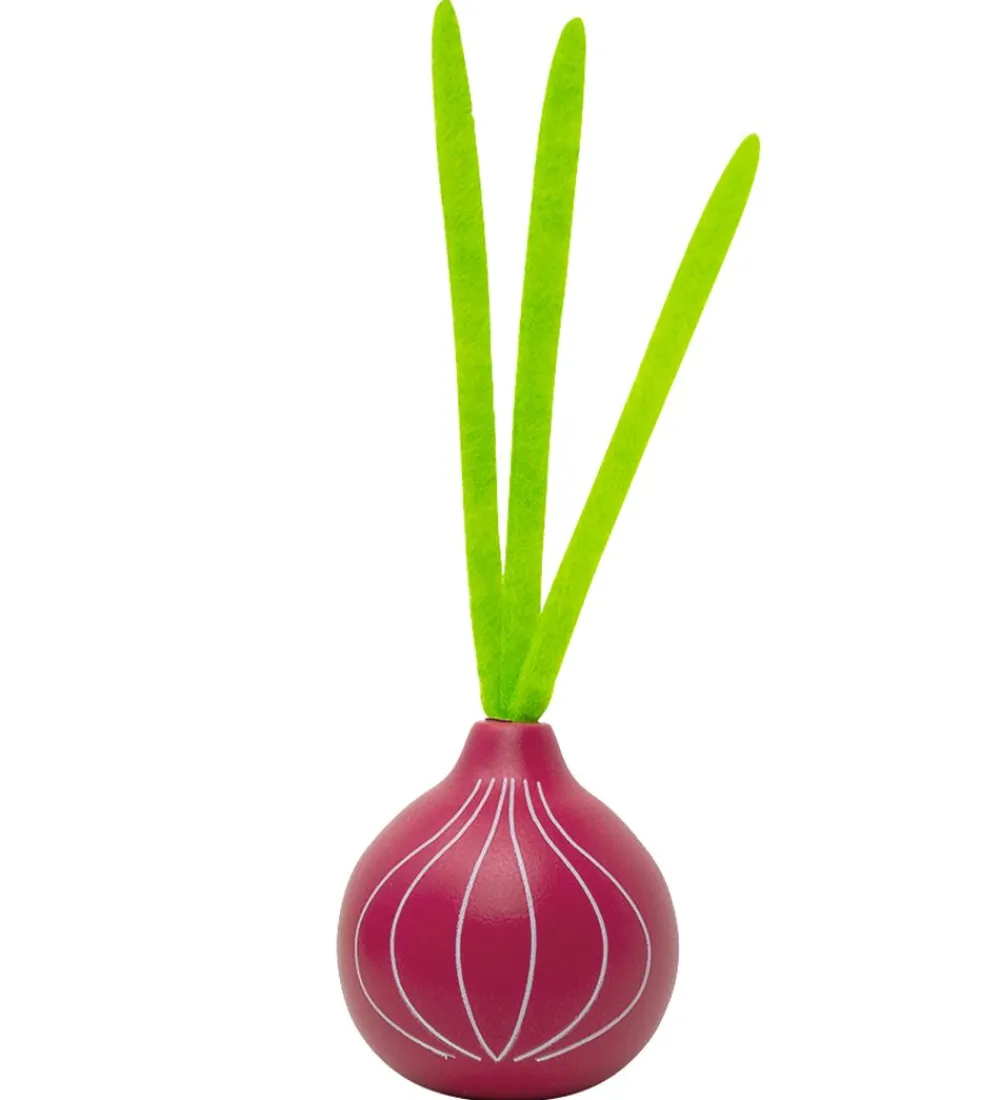 Underholdende MaMaMeMo legemad bestående af et rødløg, med tre lange grønne stykker fleece i toppen.