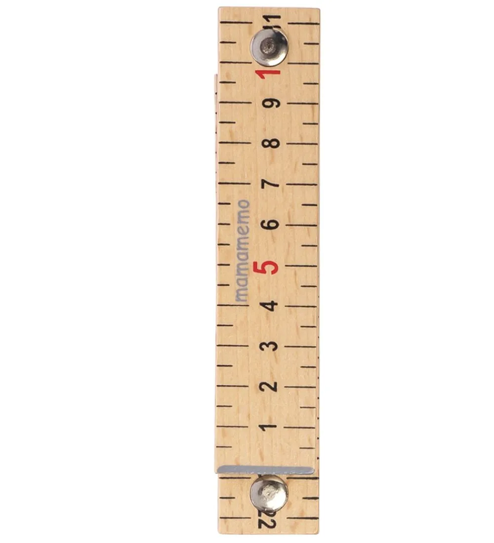 Smart MaMaMeMo tommestok i brun træ, med tal og streger i sort og rød.