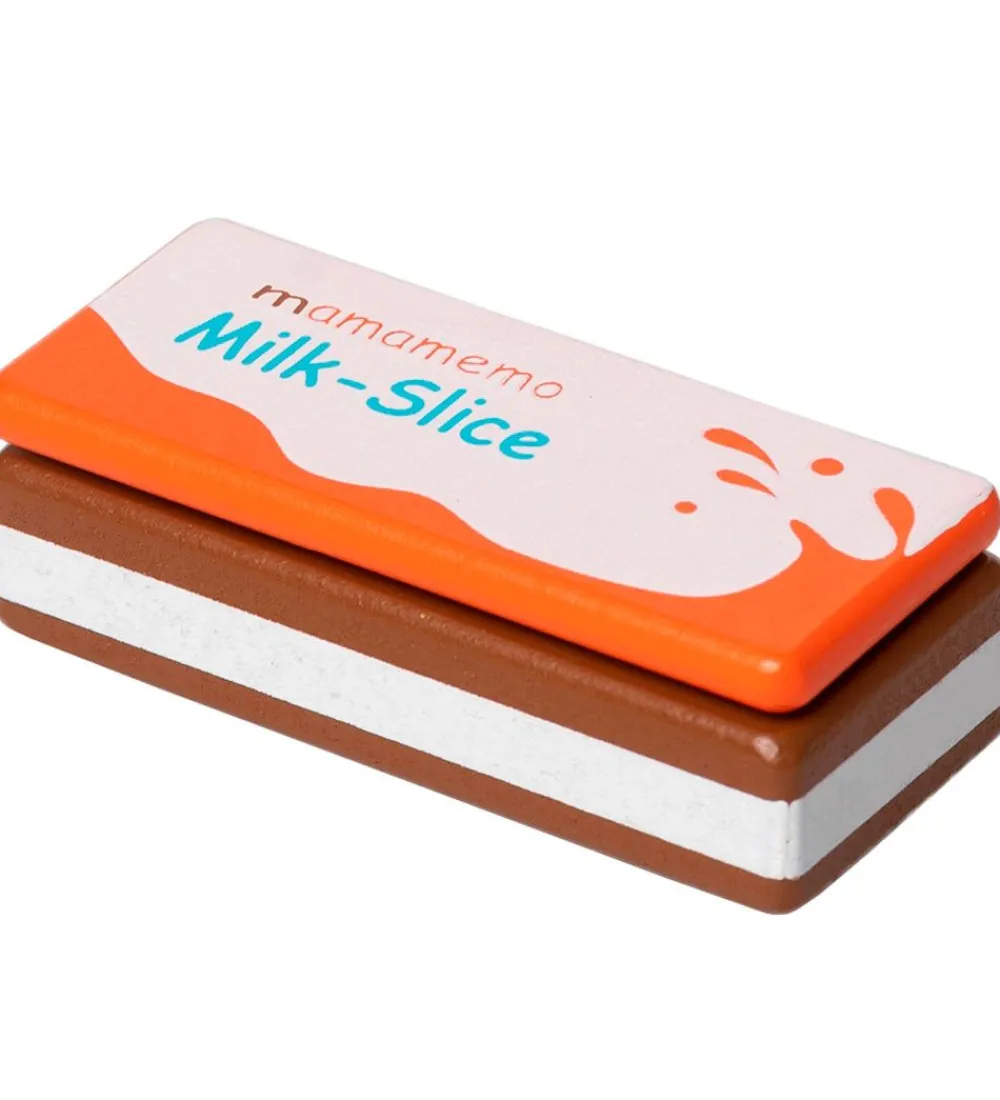 MaMaMeMo legemaden er i træ, hvor mælkesnittet er i to dele, da indpakningen kan tages af med velcro.