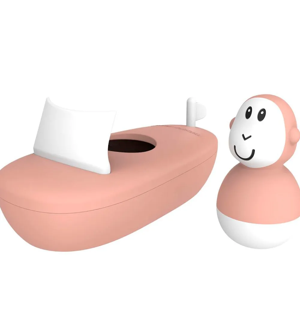 Sødt Matchstick Monkey badelegetøj bestående af en abe i rosa og hvid, med en tilhørende båd i samme farver.