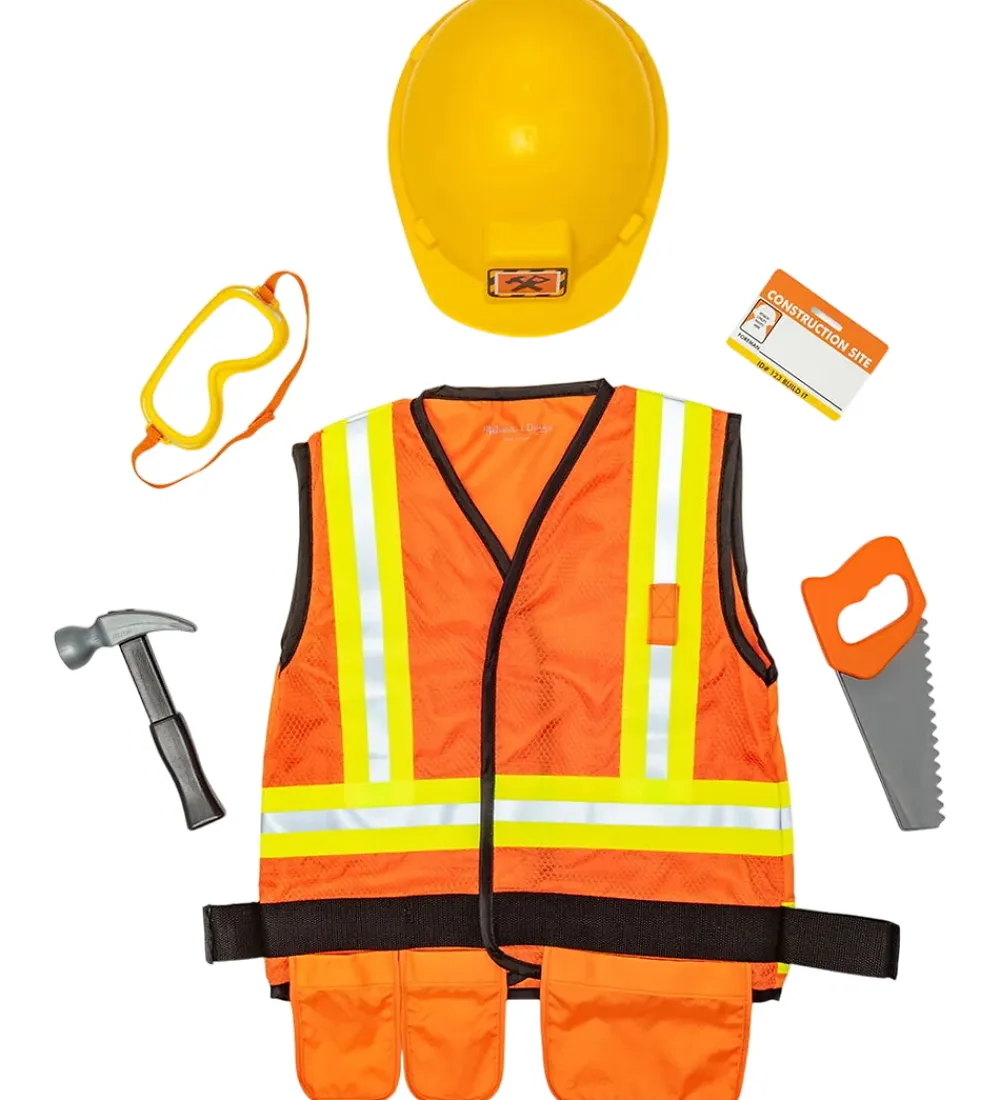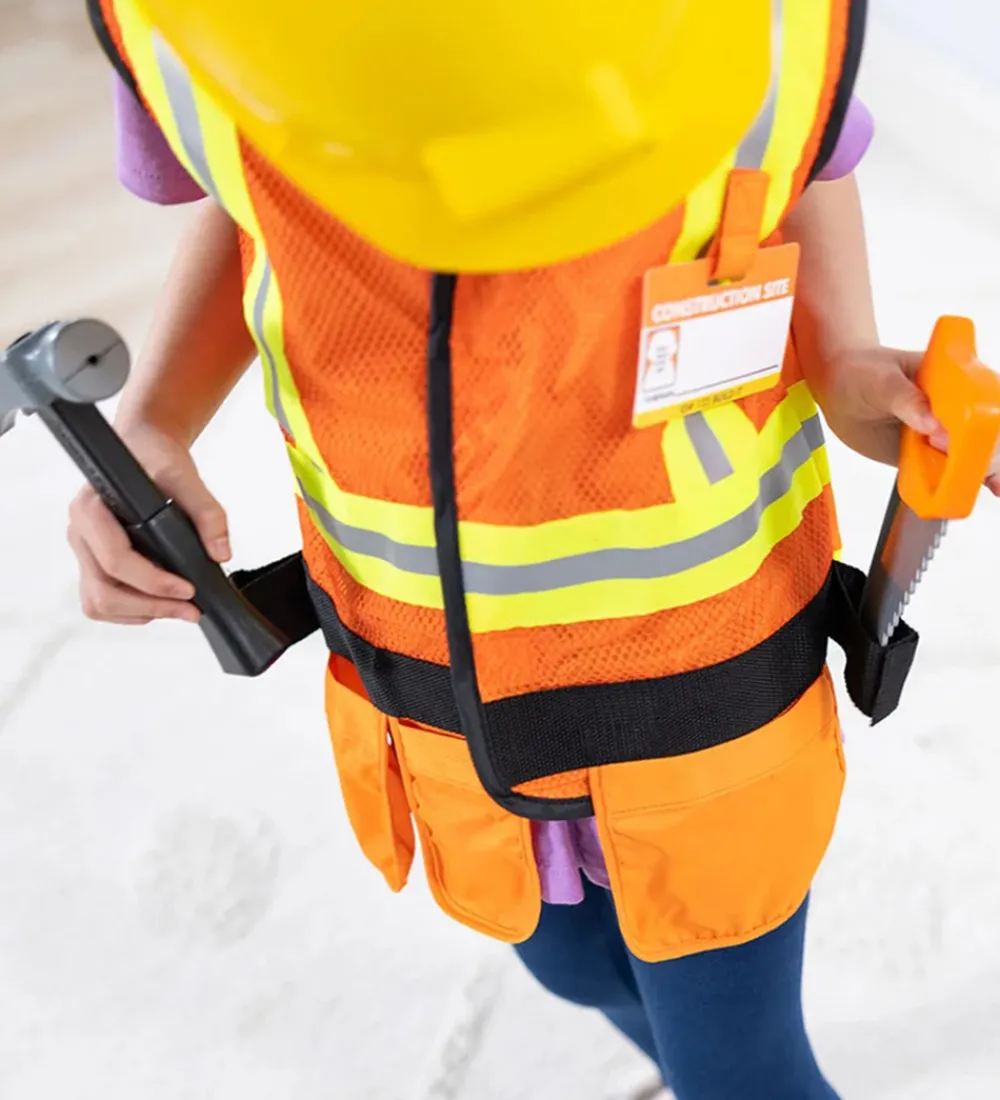 Fantastisk Melissa & Doug byggearbejder-udklædning i et sæt, der består af 6 dele med refleksvest og matchende tilbehør.