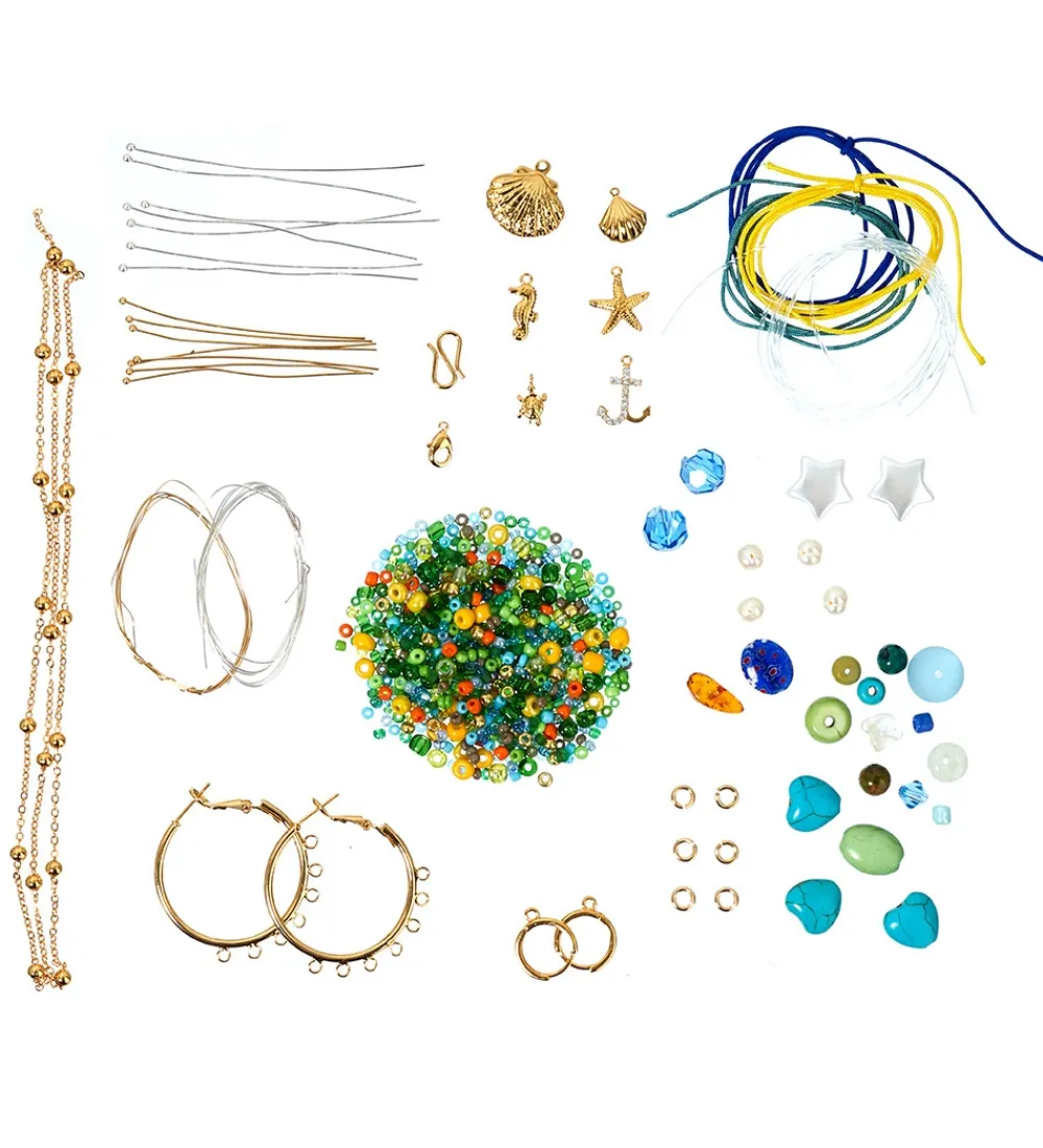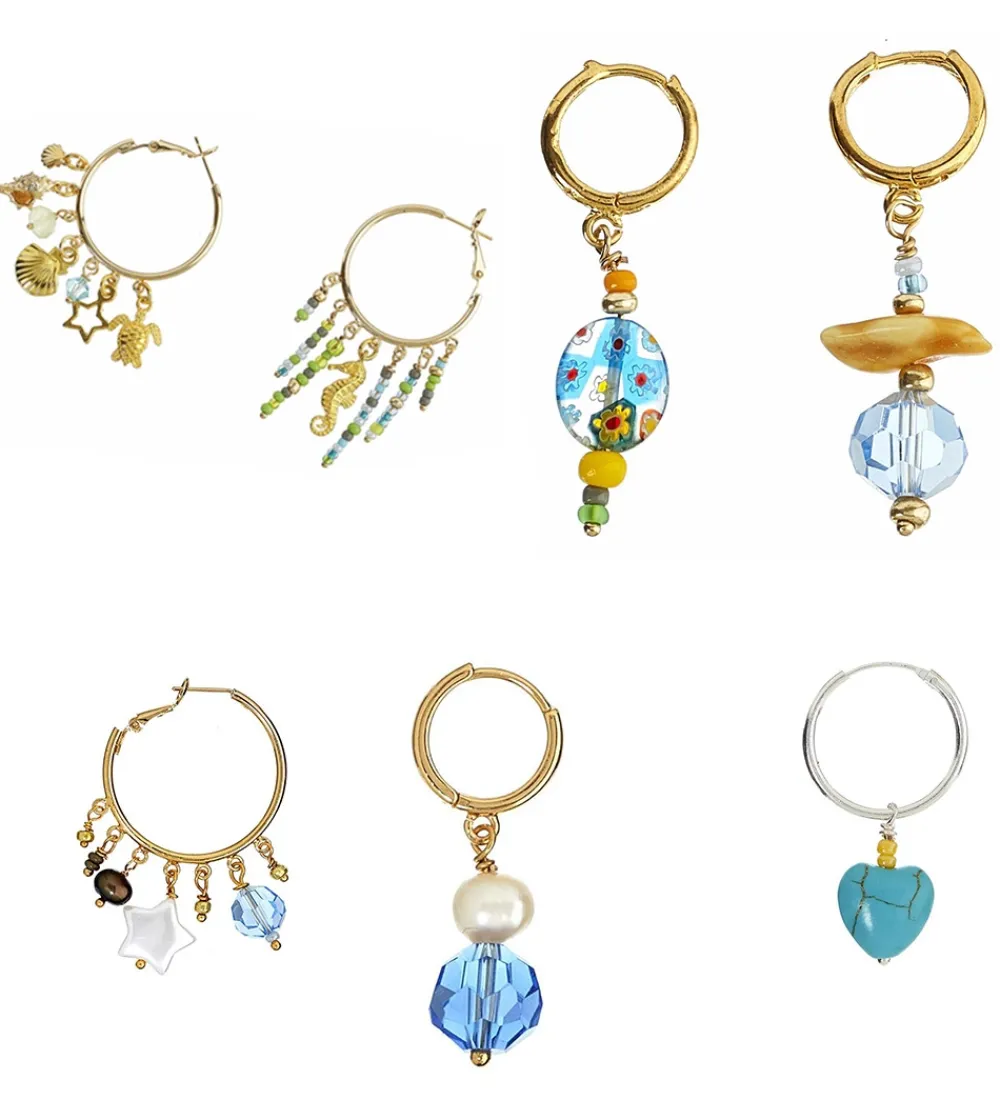 - Materialer:Store og små hoops, kuglekæde, smykketråd, øskner, låse, perlestave, nylonsnore og elastik silikone snor