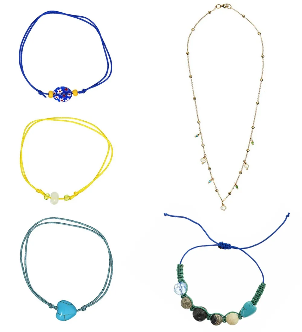 - Perler: Blanding af blå og grønne glasperler, ferskvandsperler, rav, shell stjerner og en millefiori glasperle