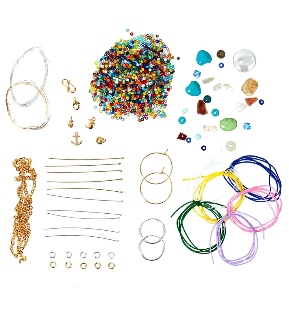 - Materialer: Hoops, ankerkæde, smykketråd, øskner, låse, perlestave, nylonsnore, silikone elastiksnor