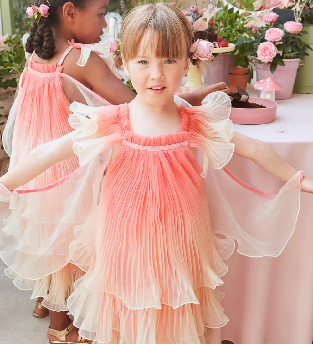 Meri Meri kjolen har brede flæseskuldre, den skørt falder i tre lag, der giver en smuk effekt. På ryggen er der flotte vinger, der har en strop til håndleddene, så den lille fe, kan brede sine vinger ud.