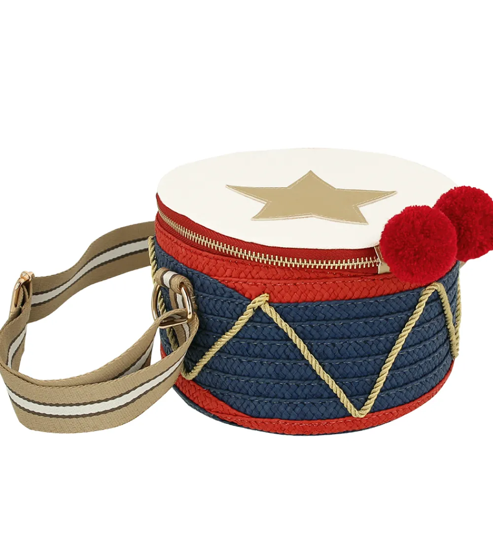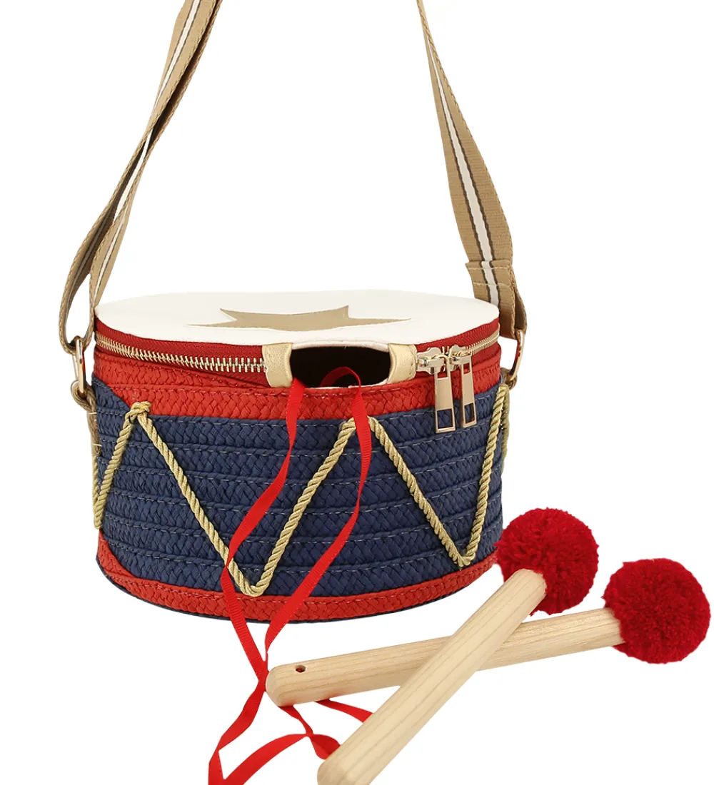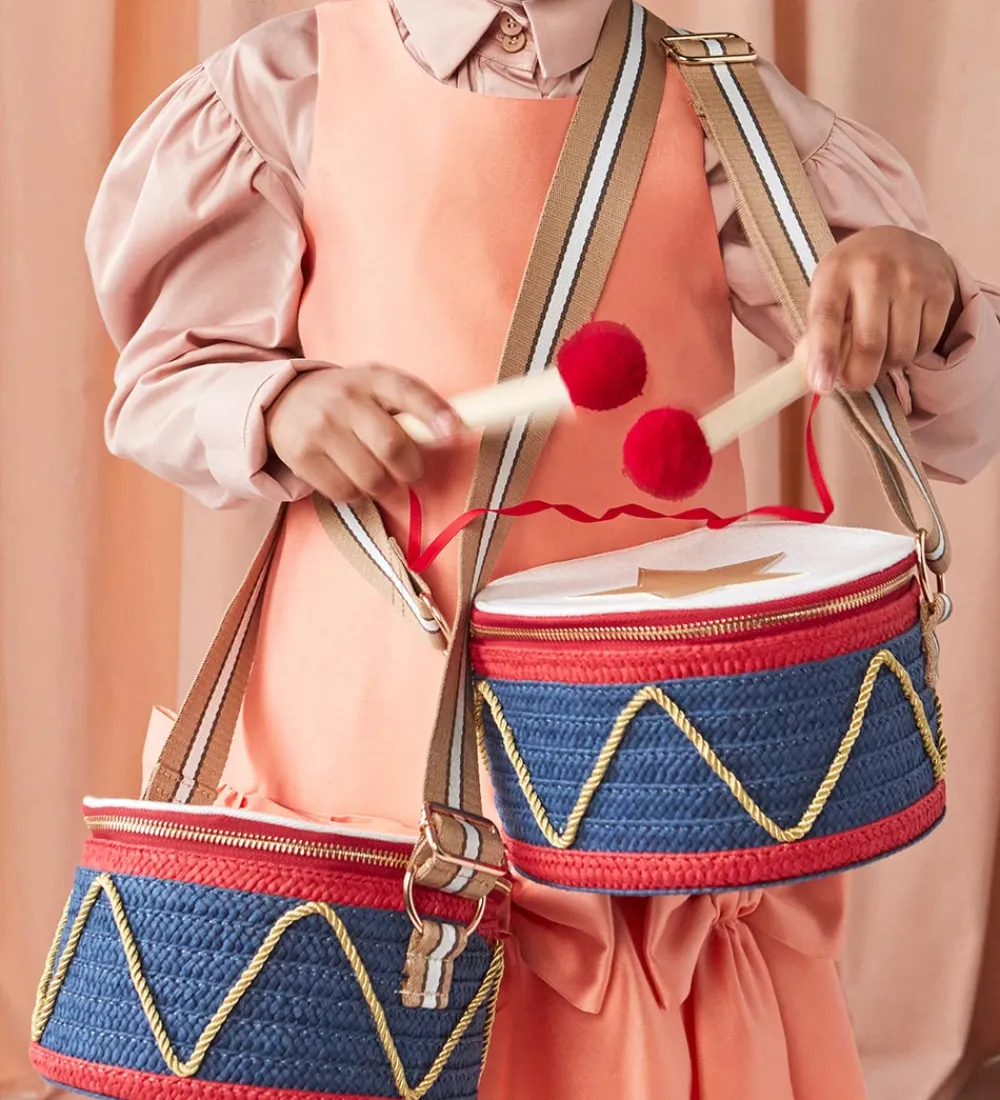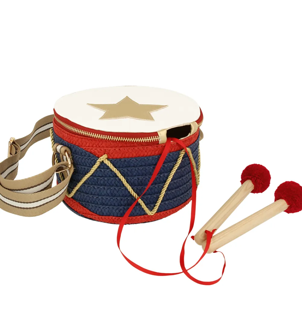 Skøn Meri Meri taske, som ligner en tromme. Den er blå med røde detaljer og med en flettet struktur og dekoreret med et guldfarvet bånd, og på den ene side er den hvid med en stor, guldfarvet stjerne. Skulderremmen er mørk beige med smalle striber i hvid og brun.