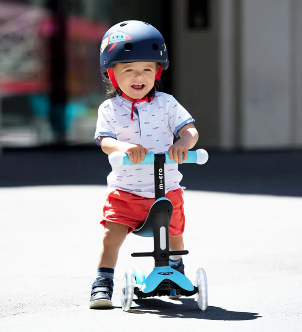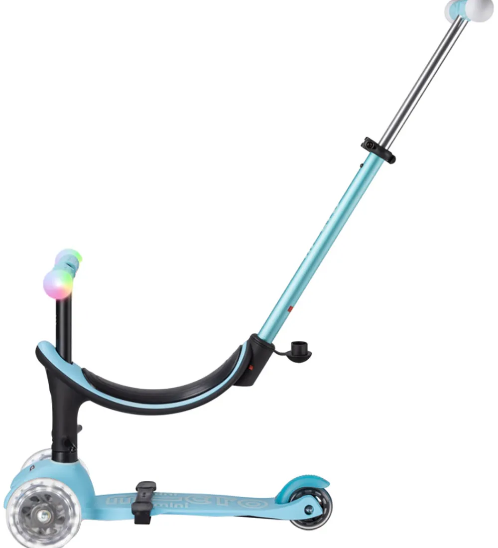 Micro løbehjulet har en praktisk multifunktion, da den også kan bruges som en løbecykel og bruges fra 12 måneders alderen og indtil 6 års alderen. Den kan bruges med sæde med mulighed for fodstøtte og skubbestang til forældrene, uden skubbestang og som et almindelig løbehjul.