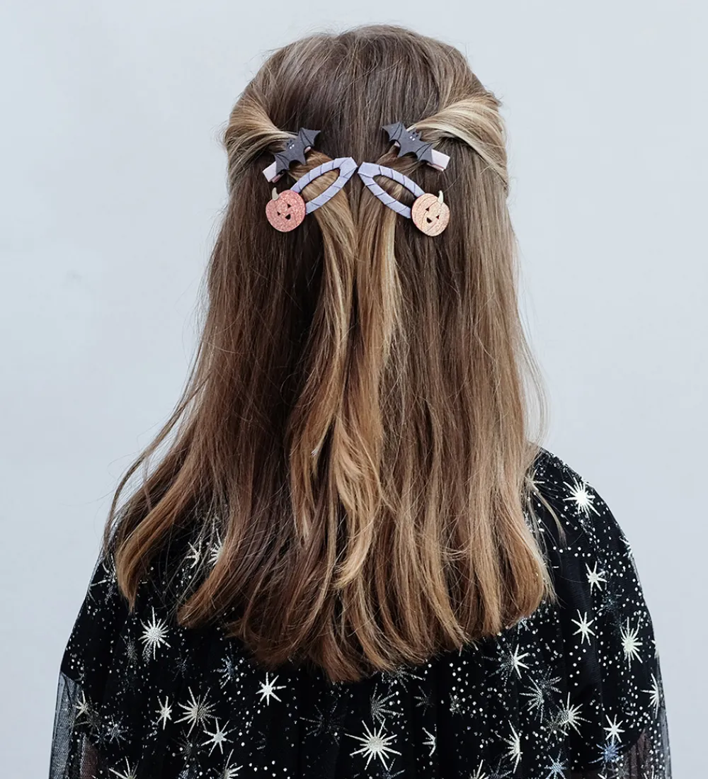 Seje Mimi & Lula hårpynt solgt i et sæt med 2 hårspænder og 2 hårklips i et halloweentema med lilla og rosa farver, græskar- og flagermusmotiver og med glimmer.