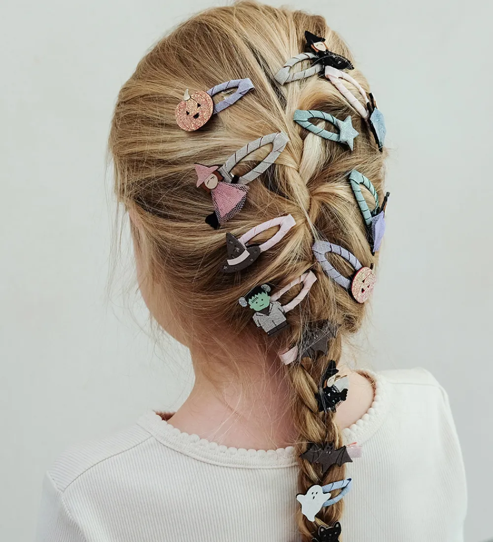 Seje Mimi & Lula hårspænder solgt i en 5-pak i pastelfarver med glimmer og flotte halloween-motiver.