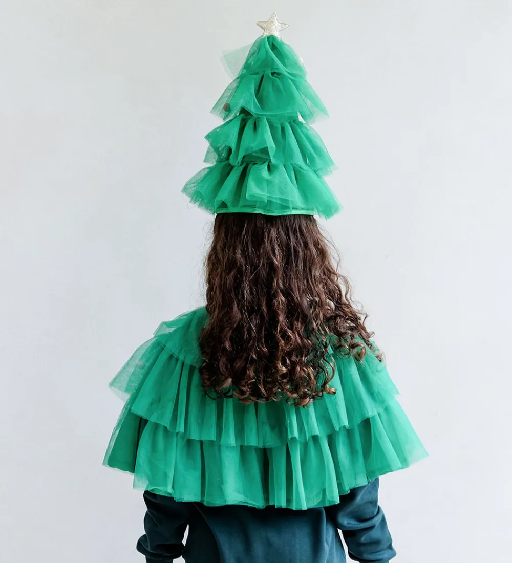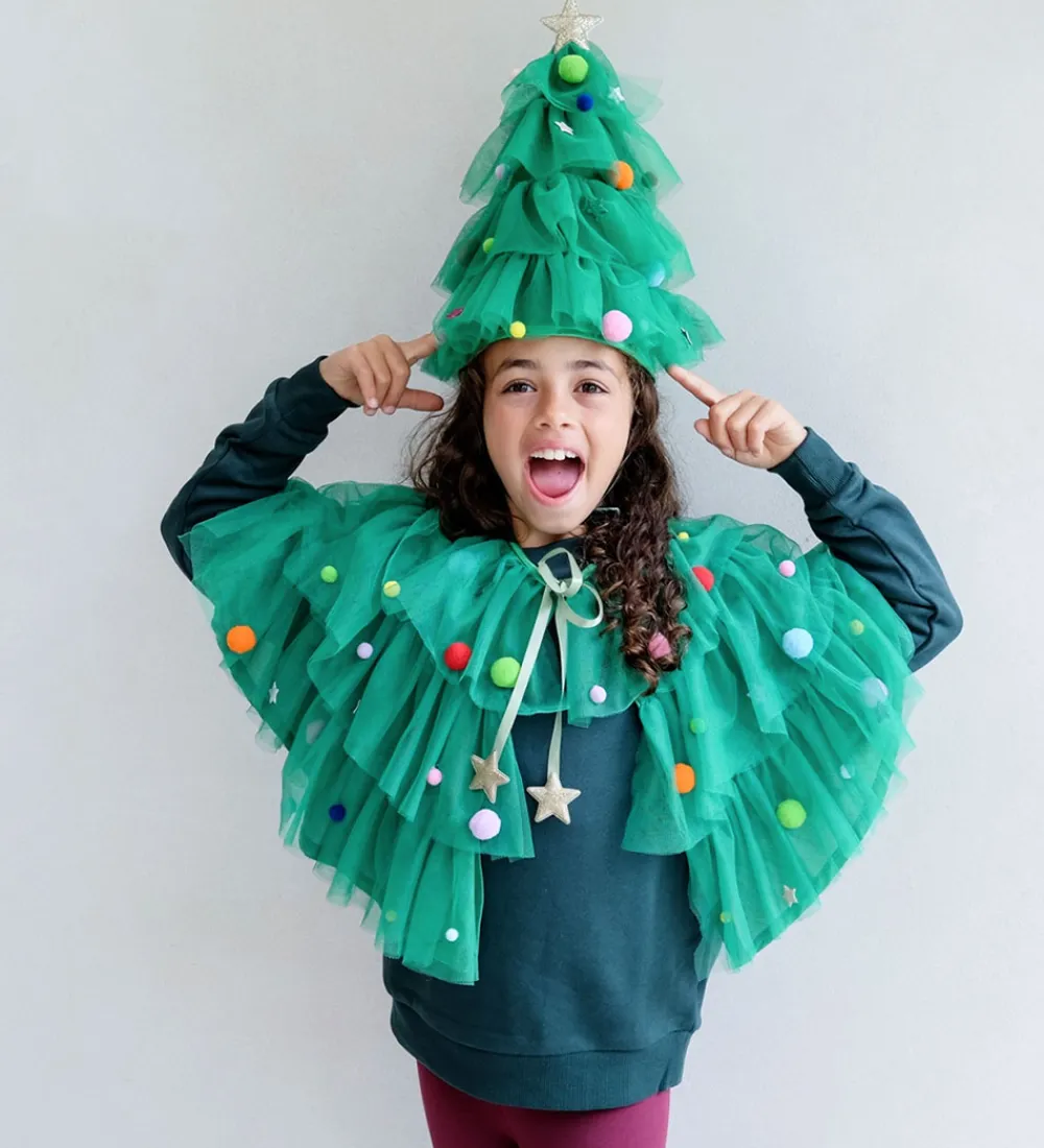 Skøn Mimi & Lula kappe i grønt tyl i flere lag, så den ligner et juletræ. Kappen er dekoreret med farverige pomponner og glitrende stjerner med glimmer.