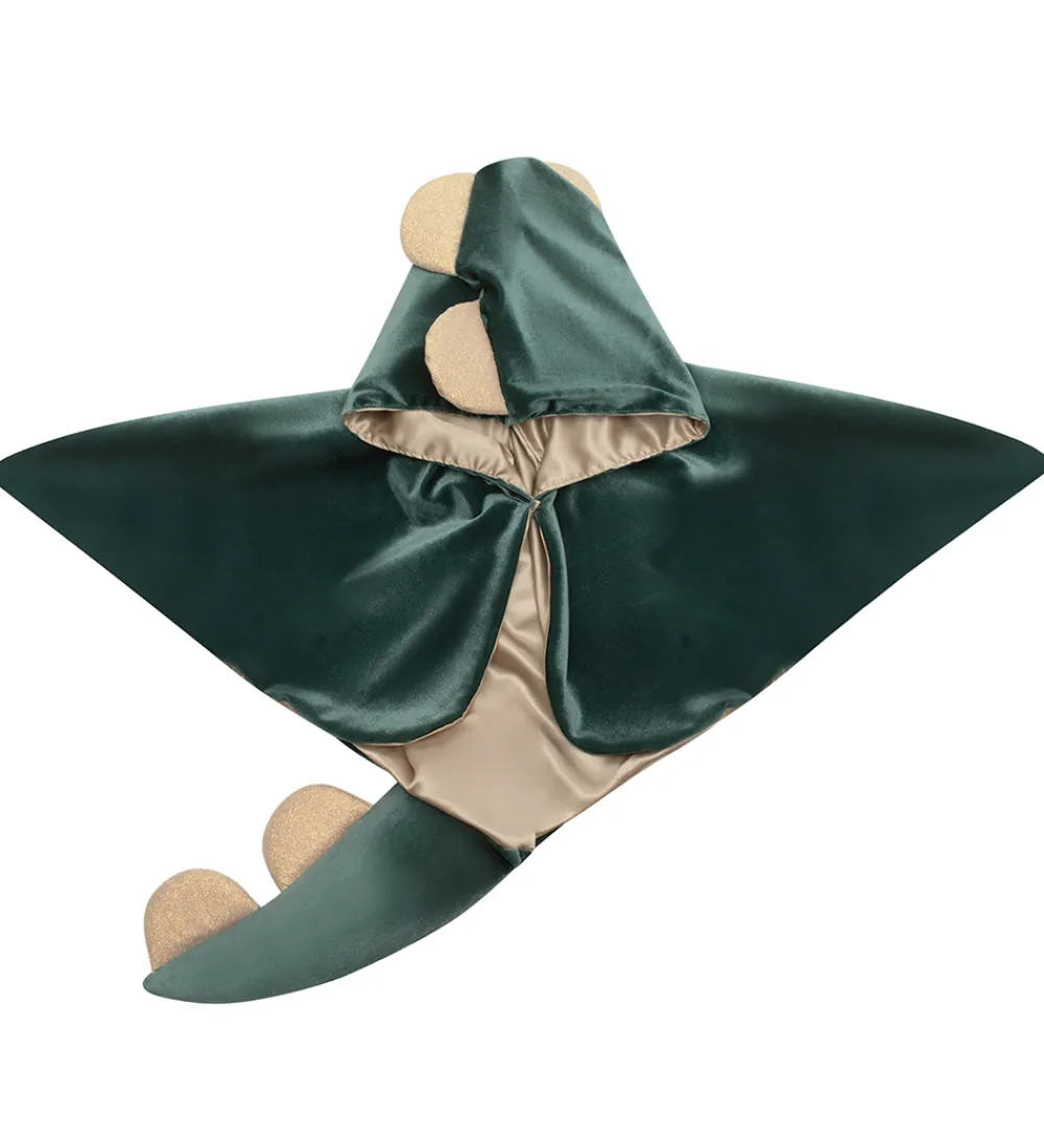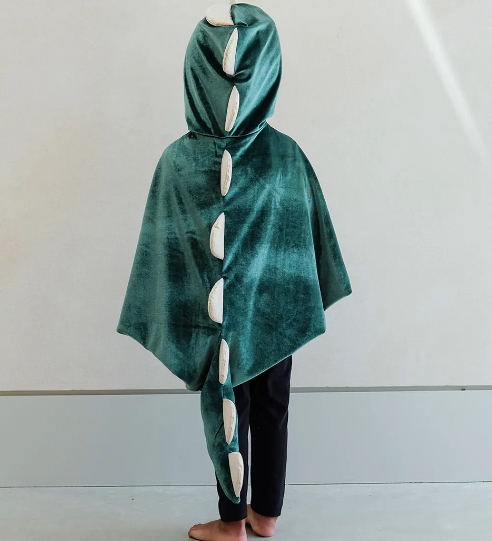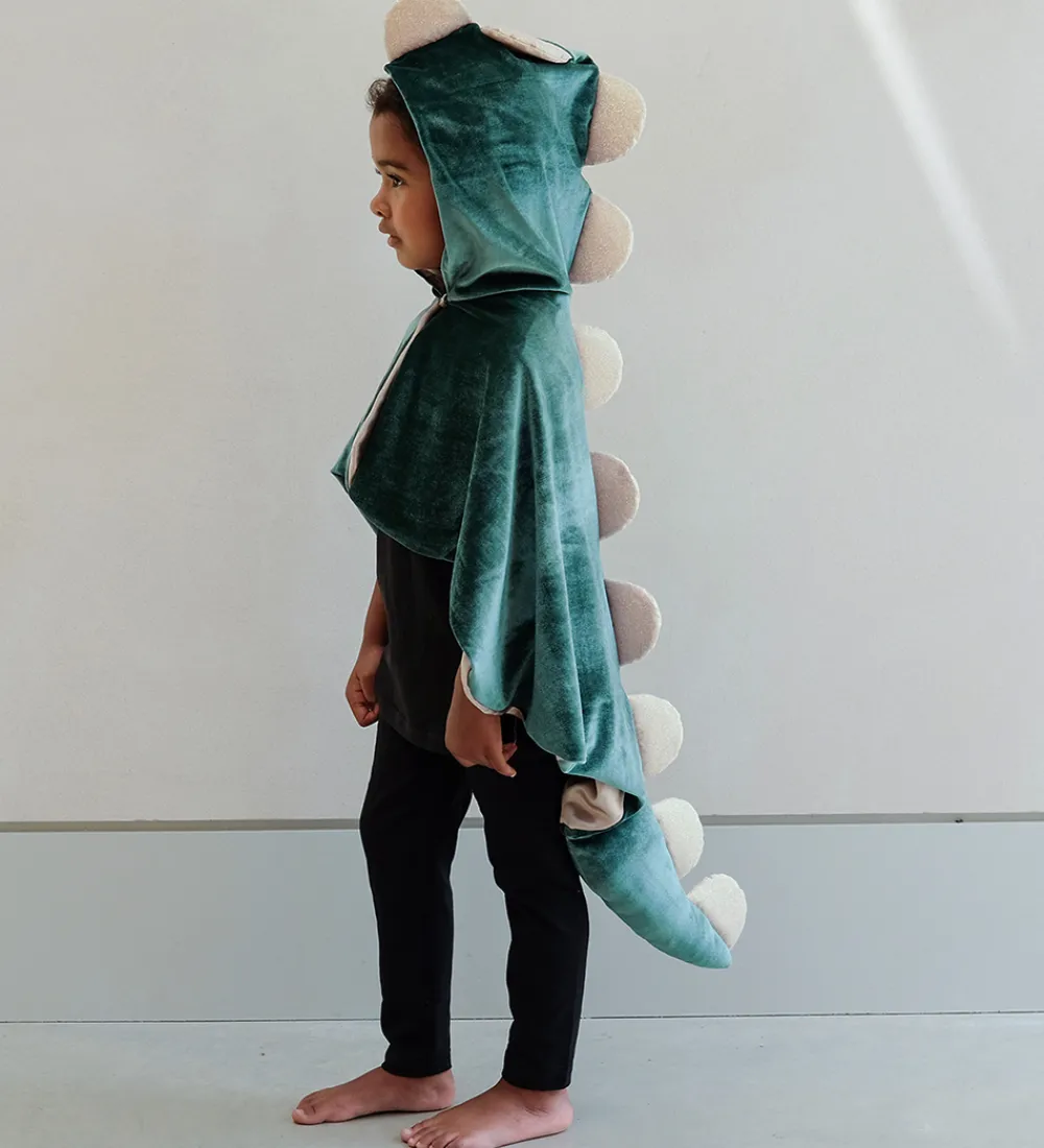 Sød Mimi & Lula kappe, der er en venlig dino-udklædning, i mørkegrøn velour og guldglimmer.