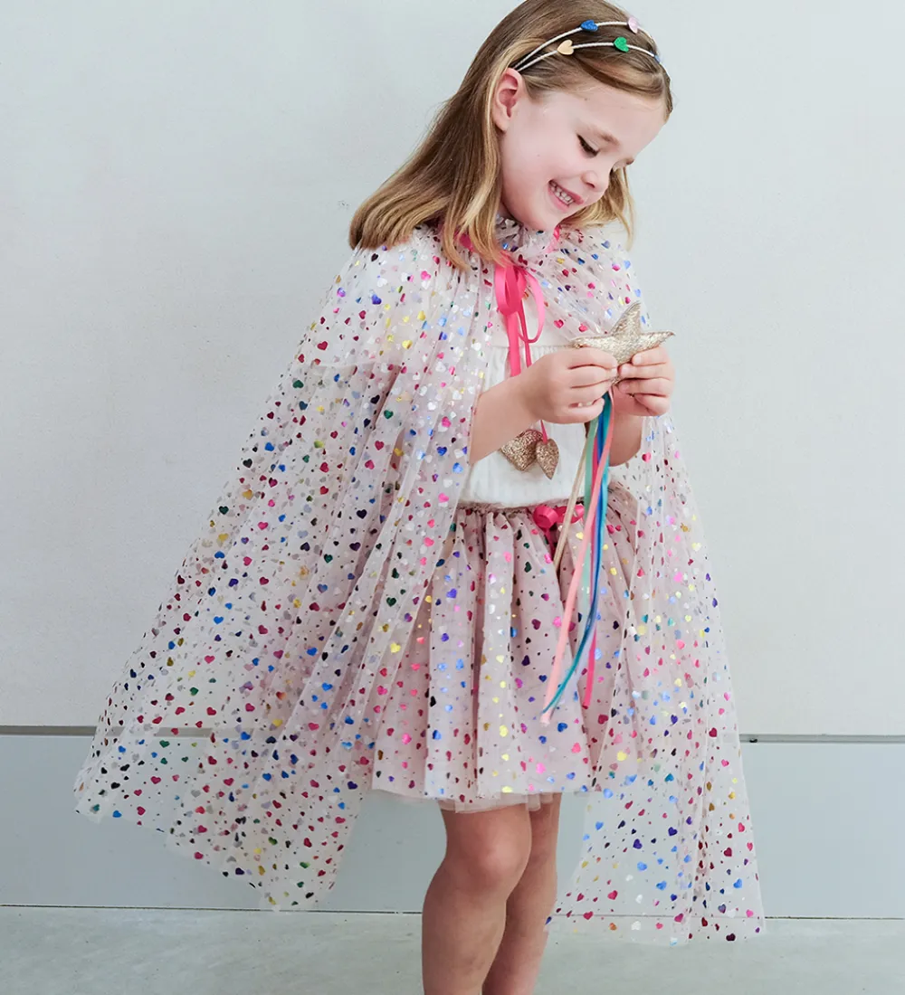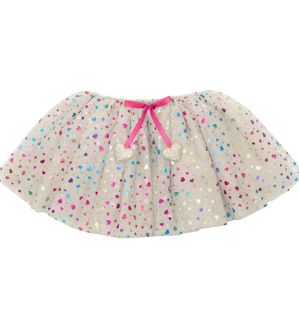 Smuk Mimi & Lula nederdel i beige med skinnende hjerter i mange forskellige skarpe farver.