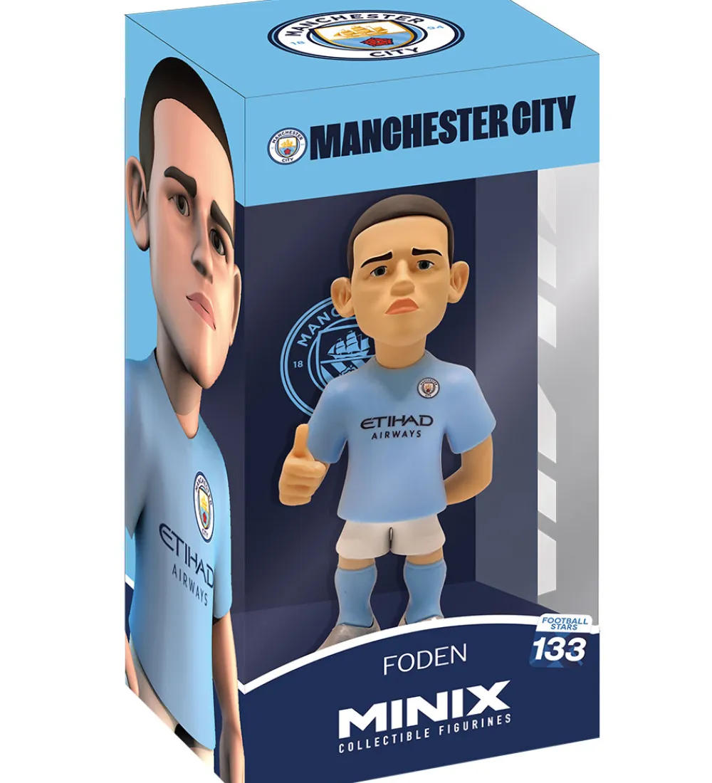 Sej Minix figur fra collectible figurines-serien Football Stars, som forestiller stjernespilleren Phil Foden iført Manchester Ciy-hjemmebanedragt.