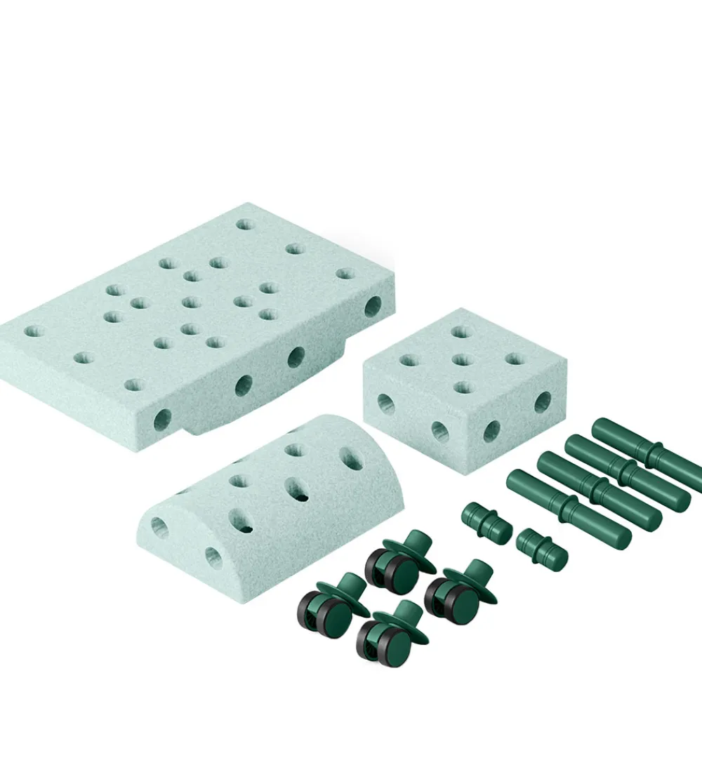 Sættet er lavet af genanvendeligt EPP-skum og fødevaregodkendt ABS. Delene kan vaskes med vand og en børste, tages med i bad og kan endda komme i opvaskemaskinen.