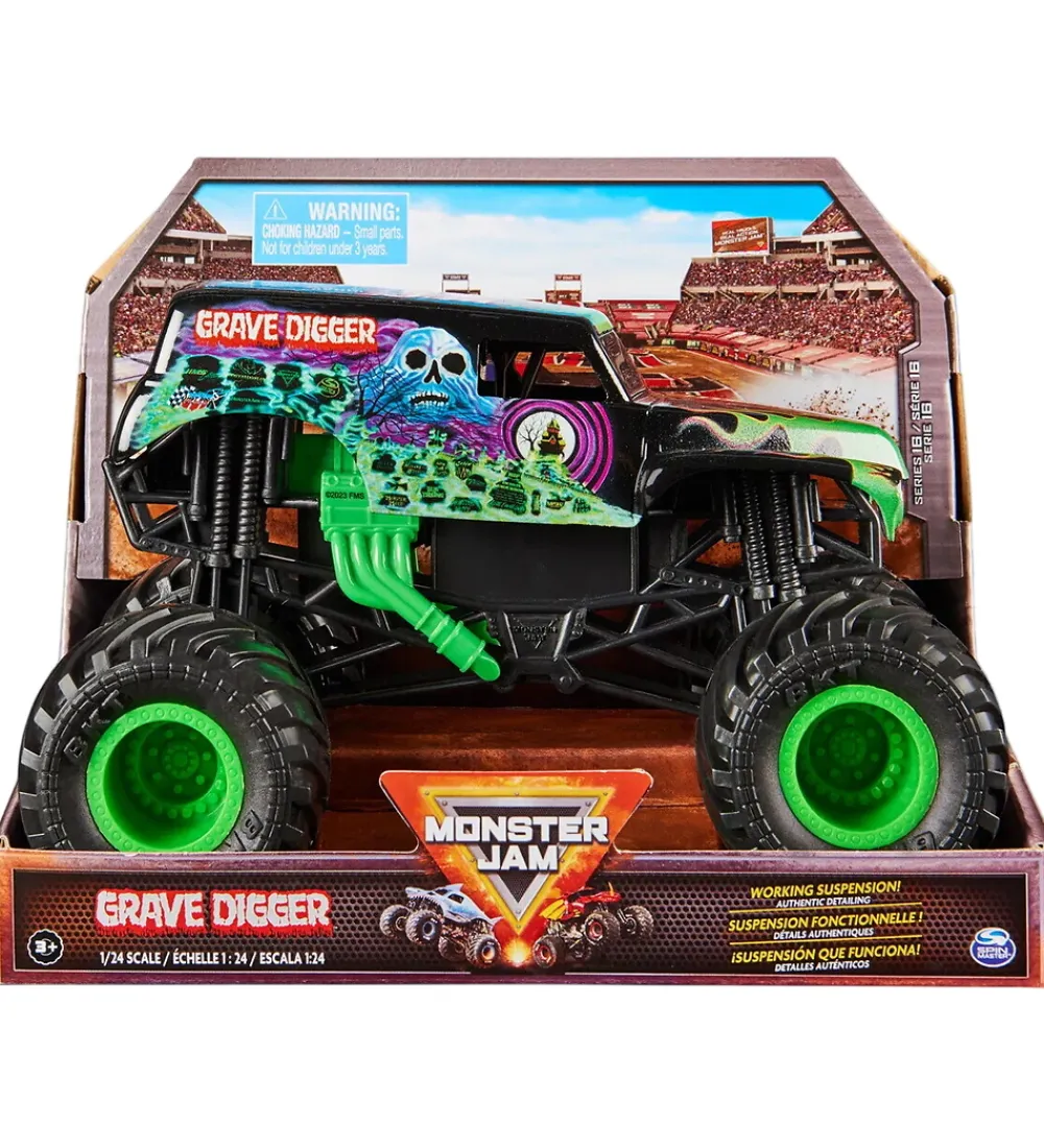 Fantastisk Monster Jam bil med et imponerende motiv af Grave Digger. Den har en sort base med grønne og lilla detaljer, der giver et dramatisk udtryk. Monster Jam sætter fokus på detaljerigdom og autentisk design.