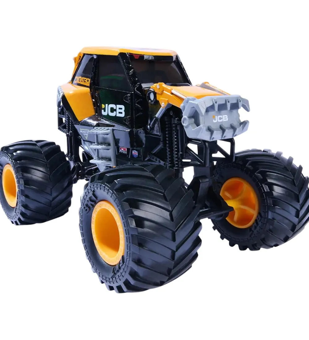Flot Monster Jam bil i sort med orange og grå detaljer. Monster Jam bilen har store hjul og JCB-logoprint, der giver den et autentisk udseende. Perfekt til små bilentusiaster.