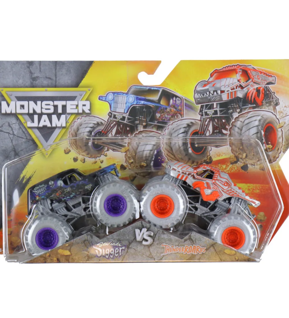 Fantastiske Monster Jam bilsæt med to detaljerede monstertrucks i sort og sølv i modellerne Son-Uva Digger og ThunderROARus. Perfekte til små bilentusiaster, der elsker fart og spænding. Monster Jam sæt giver timevis af sjov og motorbrøl.