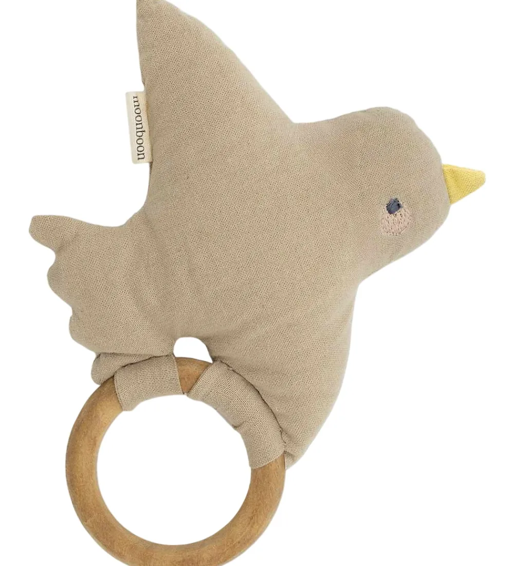 Sød Moonboon rangle formet som en fugl i beige tekstil.
