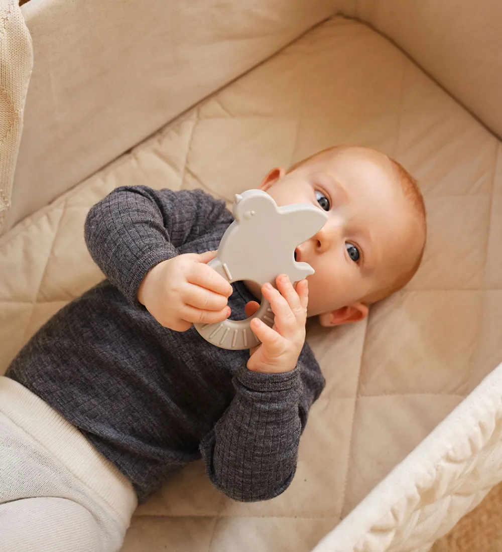Moonboon bideringene er designet med et hul i midten for at små hænder nemt kan holde fast om dem. De er fremstillet af silikone, som er behagelig for ømme gummer at bide i, samtidig med at de tåler at blive klemt om og tabt.