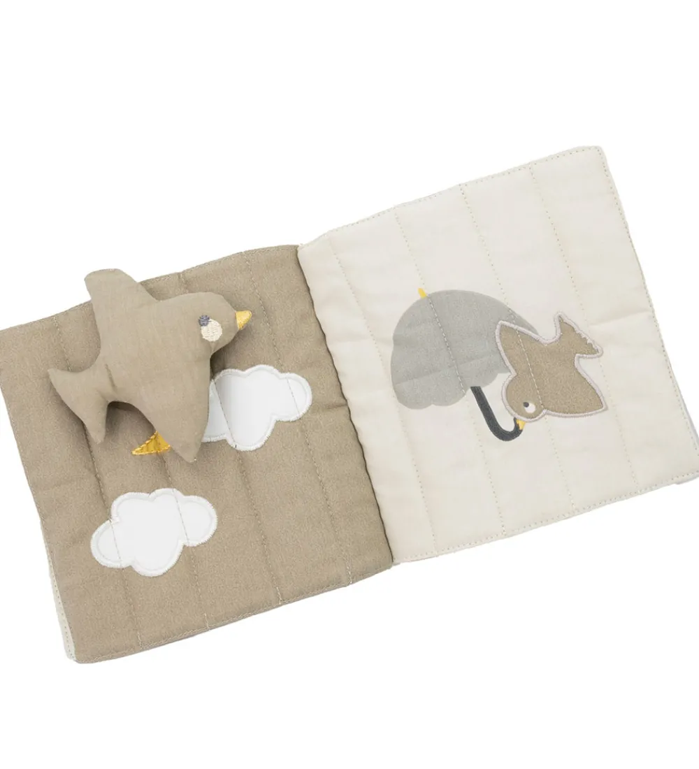 Fin Moonboon stofbog i råhvid med fine fugle- og naturprint med broderede detaljer. Stofbogen har en påsyet fugl, sky og måne, som barnet kan sanse og lege med.