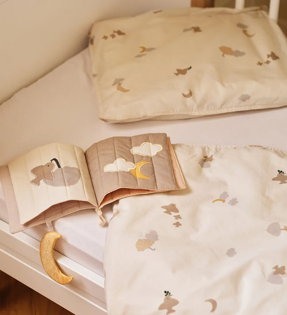 Stofbogen indeholder seks vatterede sider med en velcrostrop i toppen, så den kan sættes fast til f.eks. tremmesengen. På bagsiden er teksten “Sweet Dreams” broderet i grå. Stofbogen er hyggelig at kigge i inden sengetid.