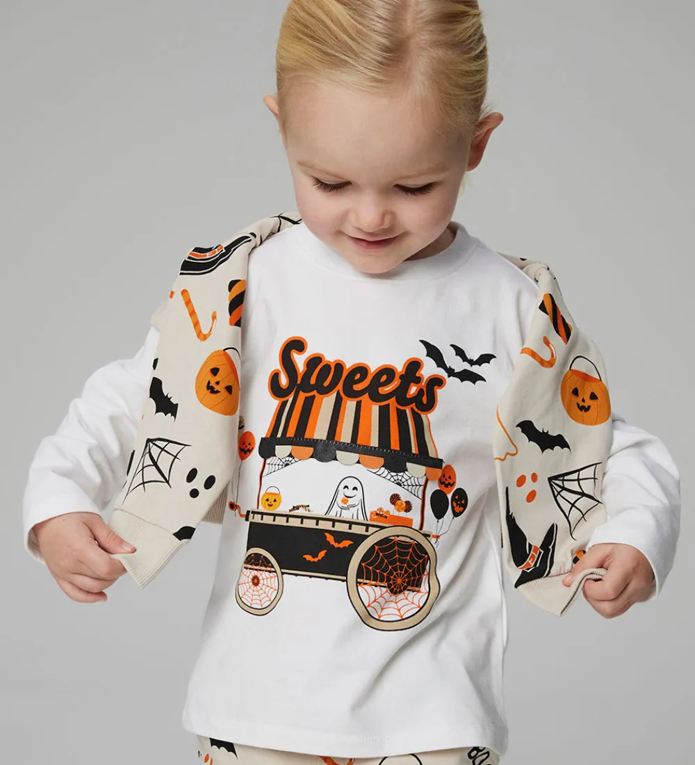 Charmerende Name It bluse med lange ærmer. Blusen er hvid med et farverigt print af en slikvogn dekoreret med Halloween-tema. Detaljer som græskar, flagermus og spindelvæv fremhæver designet. “Sweets” er trykt i store bogstaver øverst, hvilket giver et legende udseende. Rund halsudskæring sikrer en klassisk pasform.