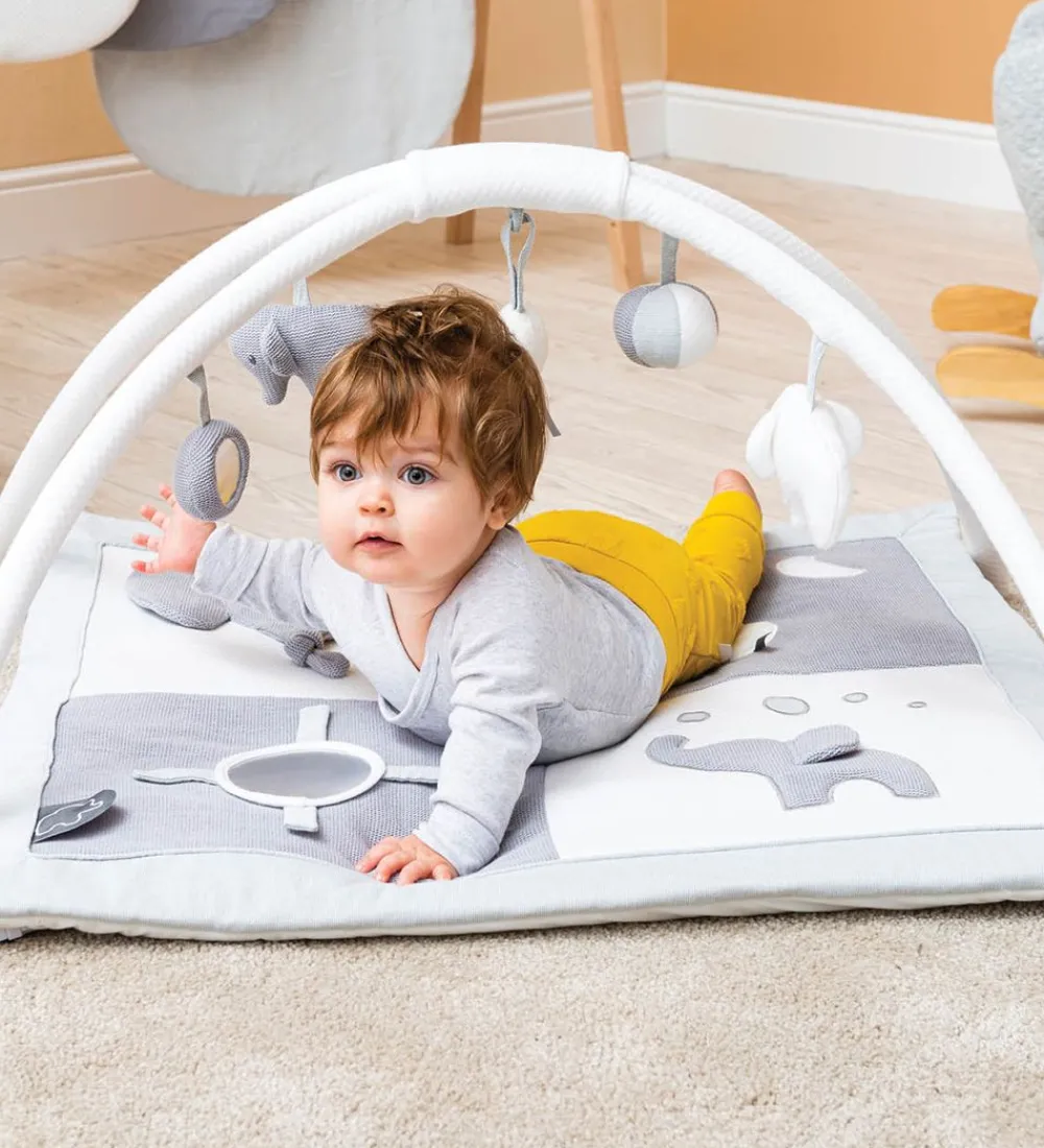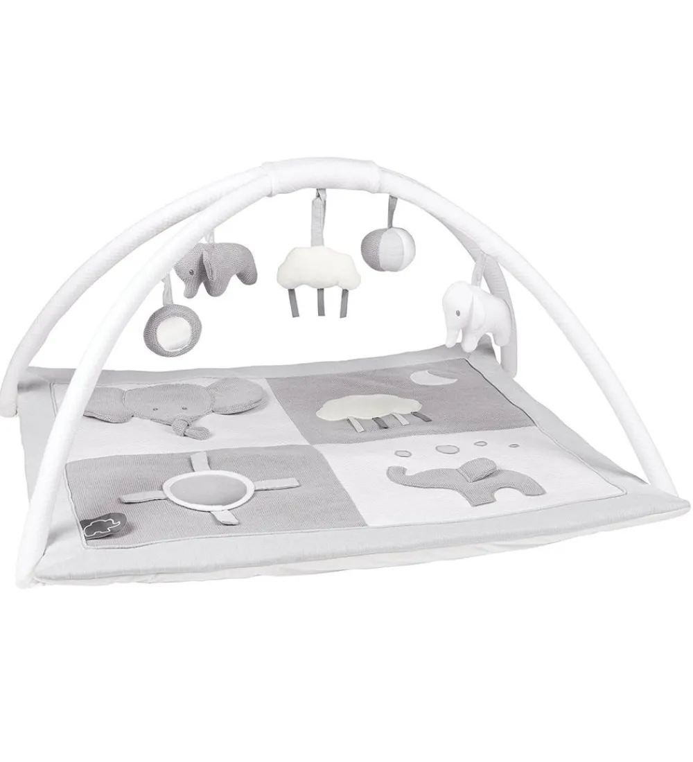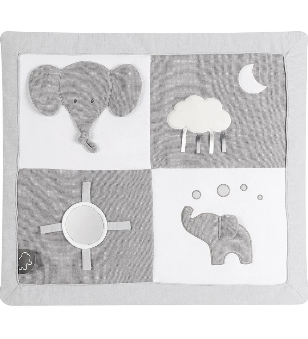 Sjovt Nattou aktivitetstæppe i grå og hvid med et elefant tema.