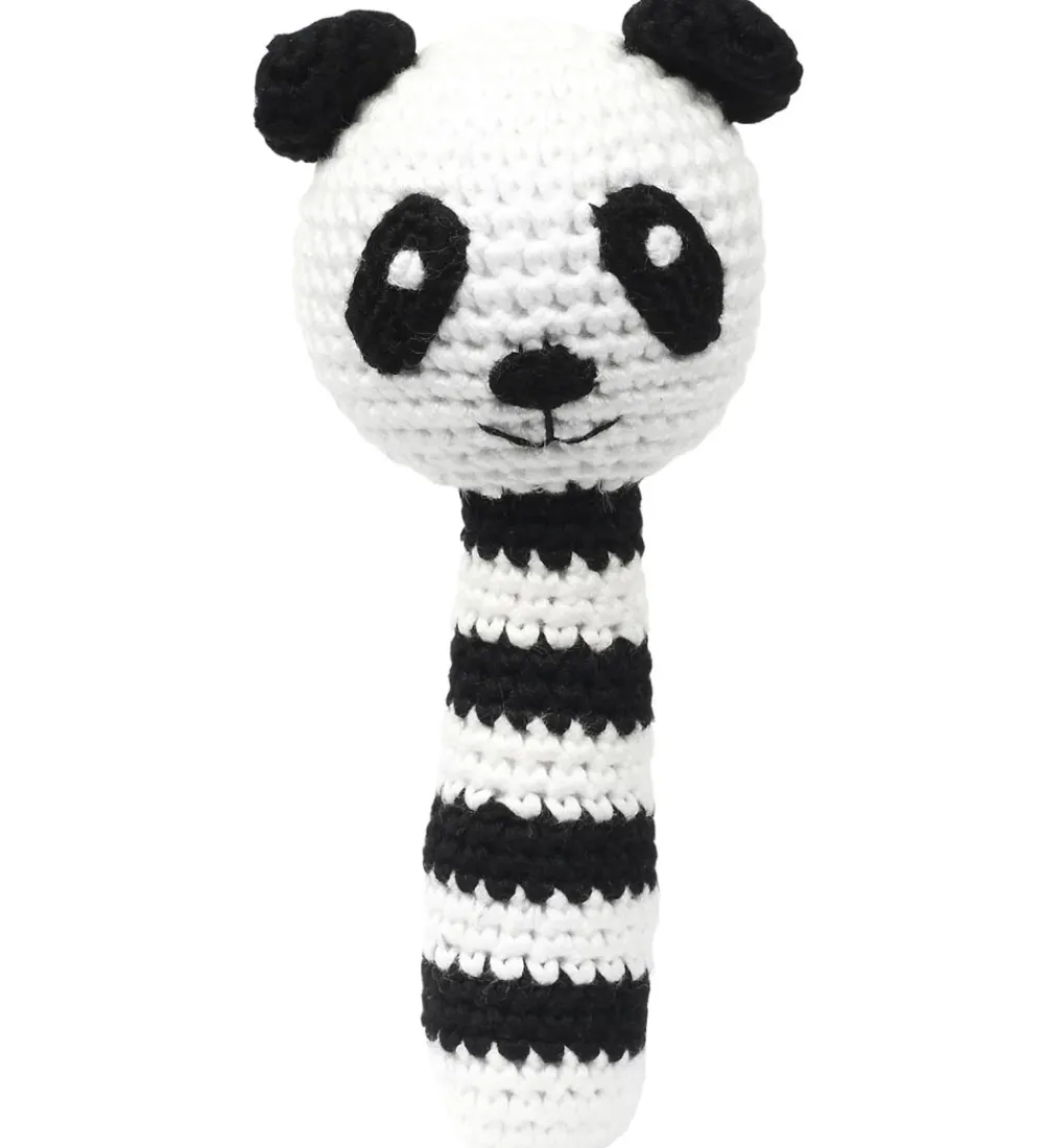 Sød NatureZoo rangle med Sir Panda med et hvidt ansigt med sorte øjne og ører samt med sorte striber på grebet.