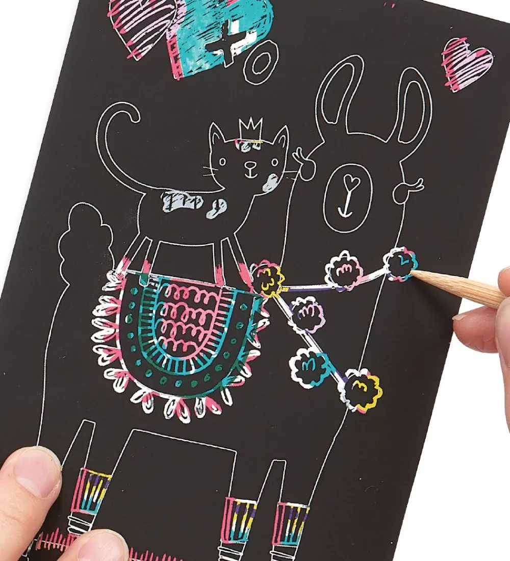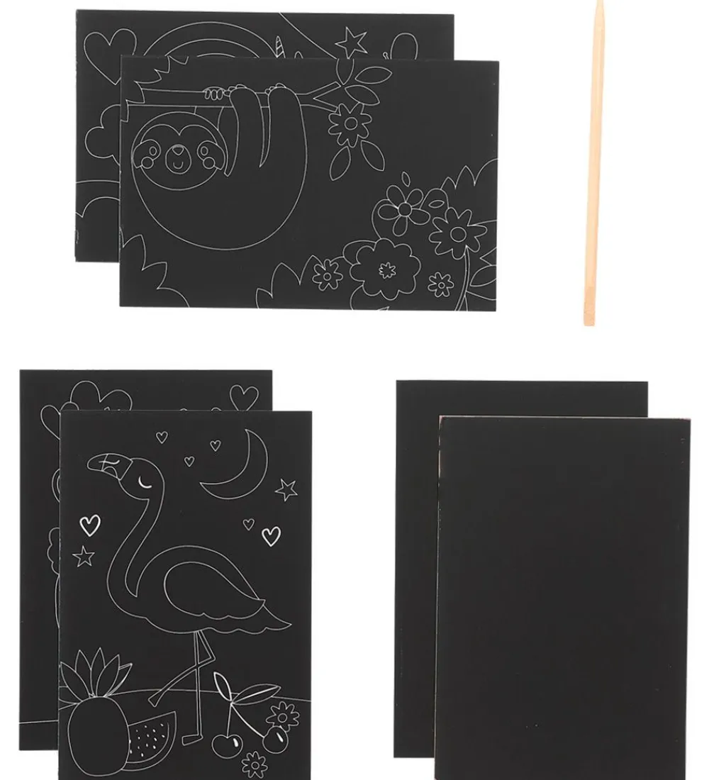 Ooly sættet består af seks kort hvor det sorte kan skrabes af med en medfølgende træpen. Fire af kortene har et motiv på, hvor de to sidste kort er blanke, hvor børnene selv kan finde på et motiv med regnbuefarvet baggrund. Kortene kan skrabes med mønstre eller som barnet nu vil have det.