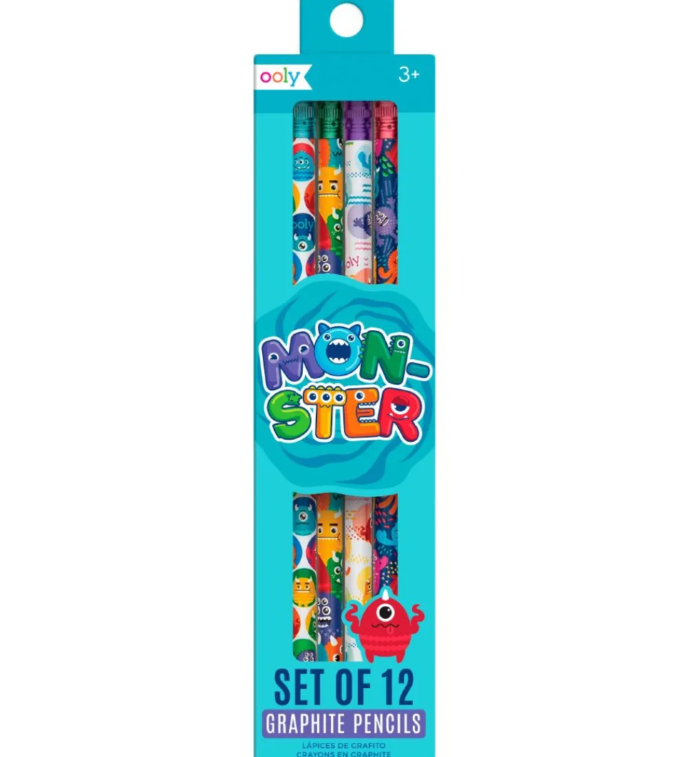 Flotte Ooly blyanter, bestående af tolv blyanter med forskellige designs med monstre, i regnbuens farver.