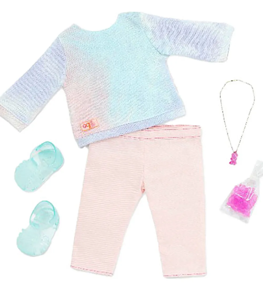 Skønt Our Generation dukketøj bestående af en langærmet bluse i blå, lilla og rosa, et par rosa bukser og semitransparante sandaler i blå. Der medfølger en halskæde til dukken med et vedhæng af en pink bamse samt en slikpose med pinke bamser i.
