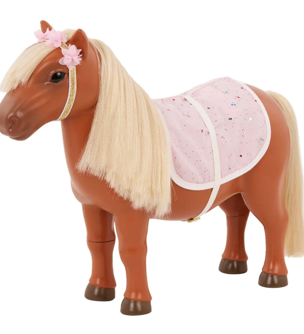 Sød Our Generation shetlandspony i brun med lys manke og hale. Shetlandsponyen har en rosa grime og et fint rosa dækken med prikker på.