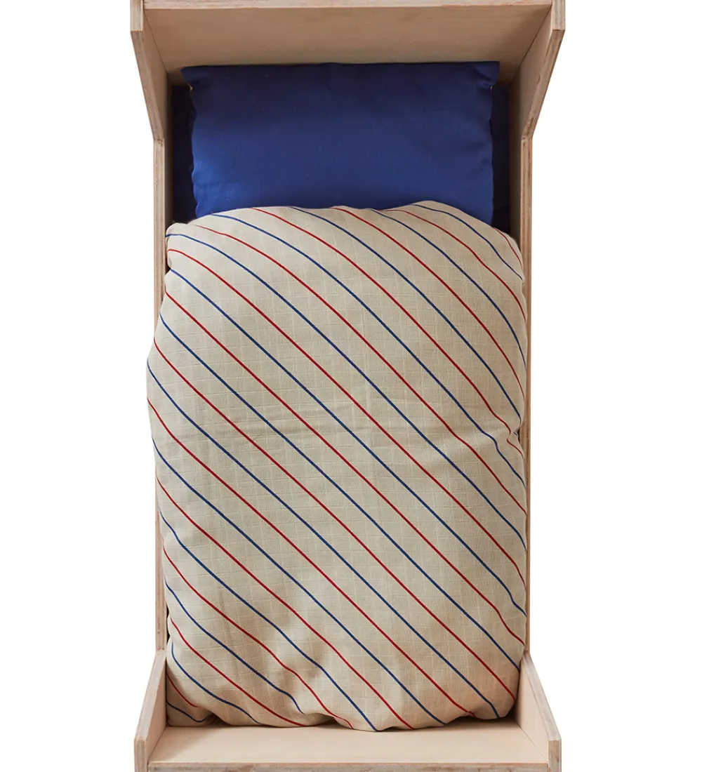 Fint OYOY dukkesengetøj som er koboltblå på den ene side og beige med smalle røde og blå striber på den anden side.