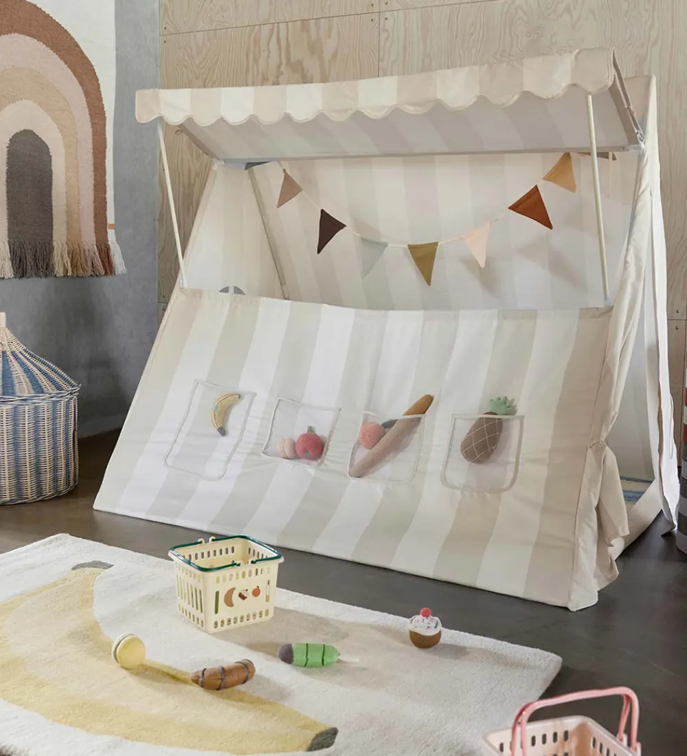 OYOY legeteltet består af et stort rum, som kan åbnes og lukkes i den ene end med bindesnore. I den ene side kan den øverste halvdel vippes op og holdes oppe med stænger af fiberglas. Nedenunder denne åbning er der store lommer, og nu kan teltet bruges til endnu flere sjove lege som f.eks. købmandsbutik, men kun fantasien sætter grænser.