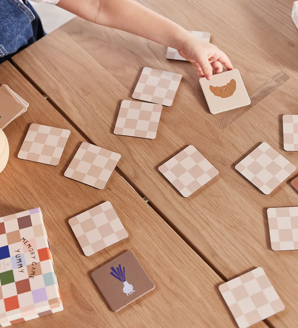 OYOY huskespillet består af 24 brikker formet som firkanter cirkler, der sættes børnenes hukkomlese på prøve. Brikkerne blandes og spredes ud med motivet nedad, og herefter går jagten efter ens par i gang.