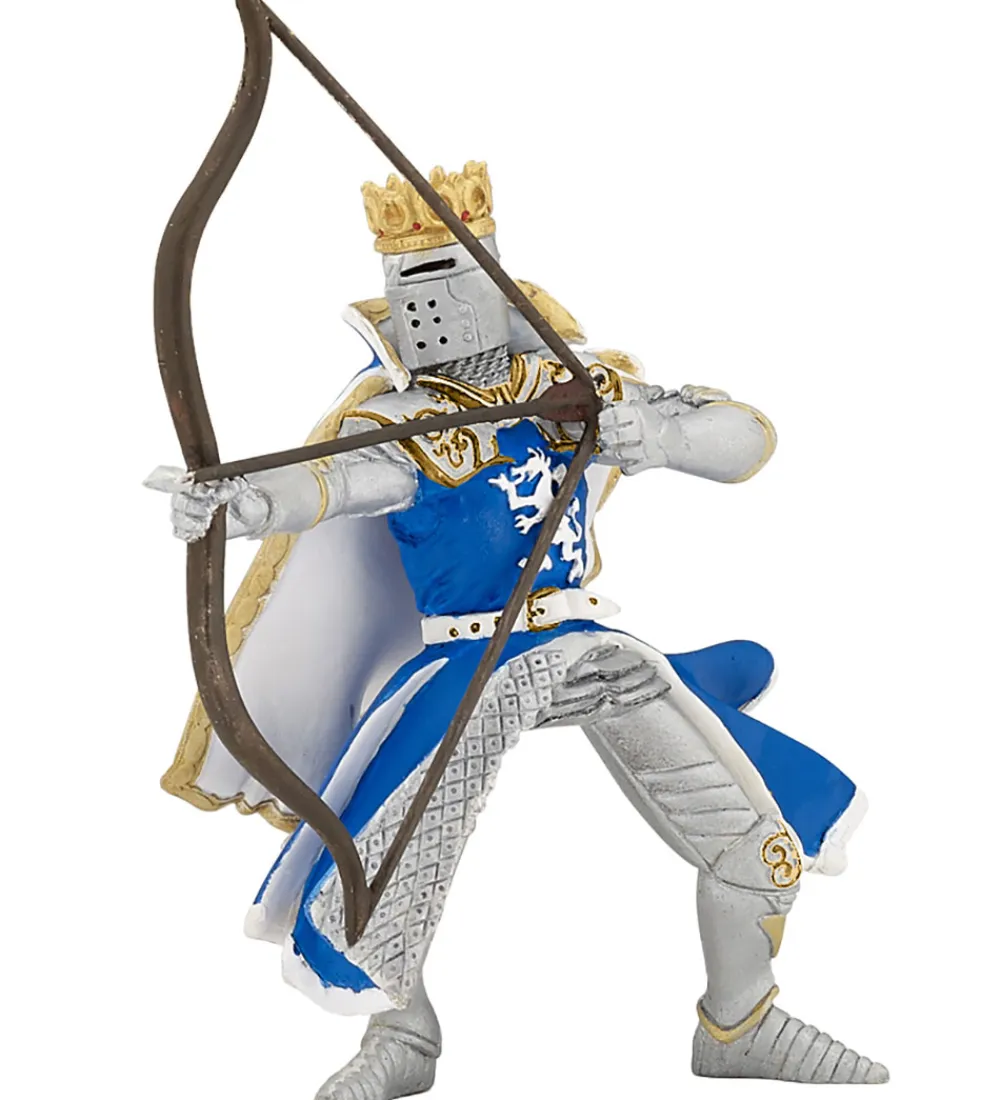 Flot Papo dragekonge med kappe og udrustning i blå, sølv, gul dog hvid. Dragekongen er kampklar med sin bue og pil i hænderne.